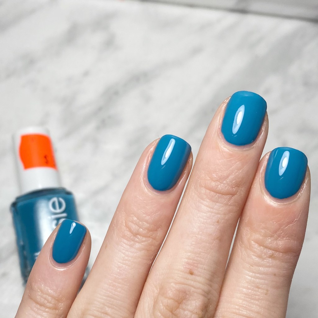 Formula is pretty good on this one — I could almost do one coat, but I applied a second for full coverage. It dried down a bit flat, but adding top coat gave it that glossy finish you see. The colour is a beautiful blue leaning teal that you just know needs careful removal because it’ll be a stainer. I’m still wearing this shade, so we’ll see how it goes when I attempt to remove it tonight!