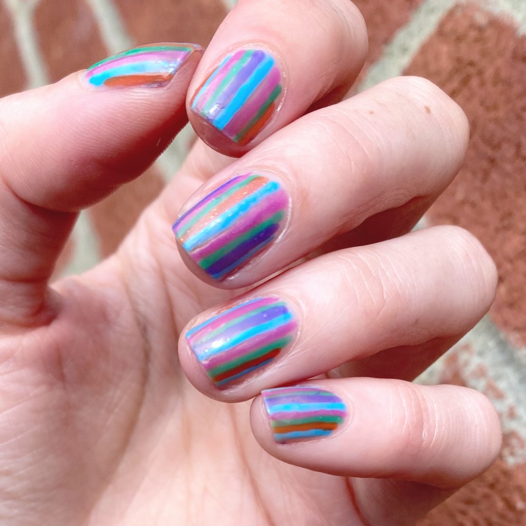 I also tried to sneak in some Starshower but it was much harder to draw stripes off! Next time, I would probably use it as my base shade, & draw my stripes over top with a little bit of naked sparkle peeking out from underneath.