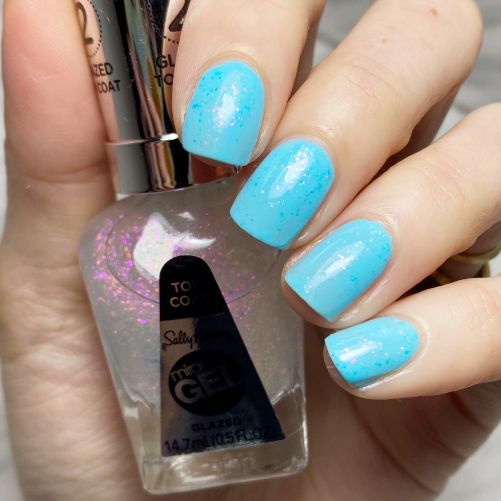 From 90s vibes to Cinderella vibes, I have Sally Hansen Miracle Gel Glazed top coat, which is a beautiful iridescent topper. For my swatch, I did two coats over Did I Blue That?