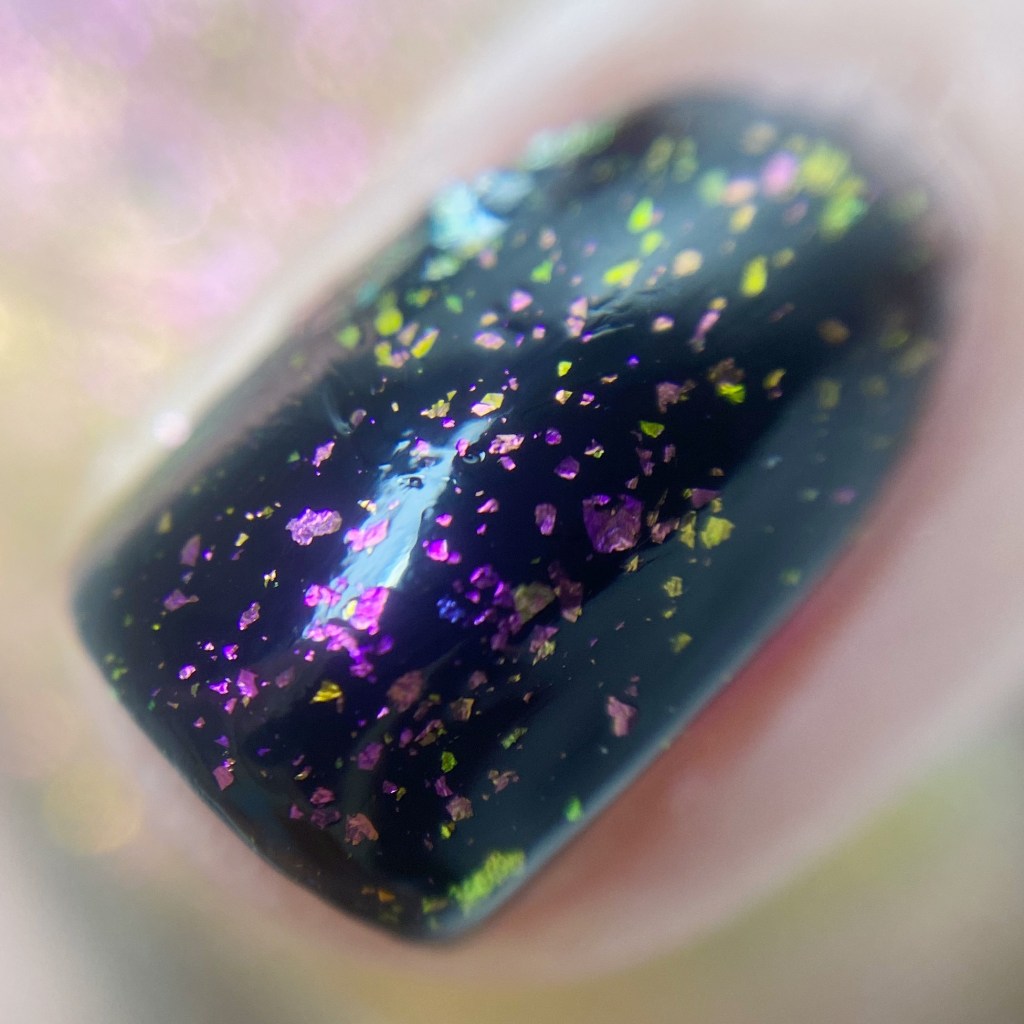 This top coat is incredible. The flakies are slightly larger than in the Glazed top coat, but shift between gold, green & pink. As you can see from my micro shot, the shift is intense. Trust me, you’ll be seeing a lot of this shade over the next couple months, especially when I break out my Autumn shades!