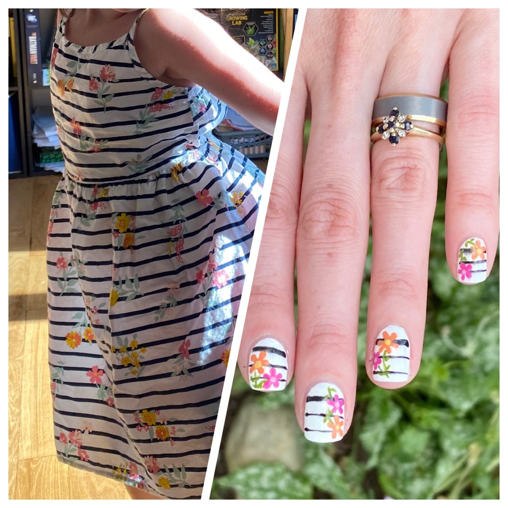 I’m also super excited to show off today’s nail art look. You know the saying “nail art inspiration can come from anywhere”? Well I definitely took that to heart with this nail art look. Recently, I took my daughter thrifting & found the sweetest Summer dress for her, & the second I saw it, I knew I was going to need to do some nail art inspired by it. I’m a sucker for anything floral, & the simple sweet pattern was too cute not to do on my nails!