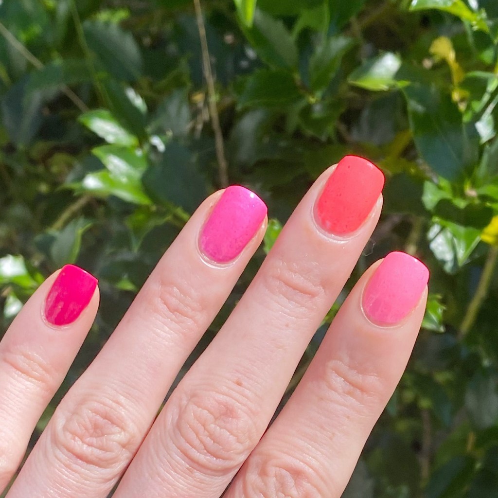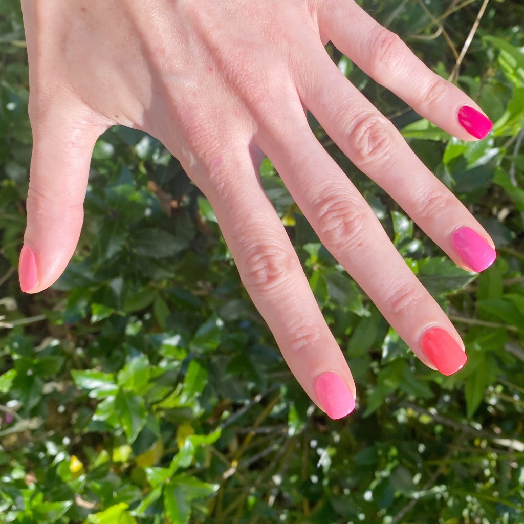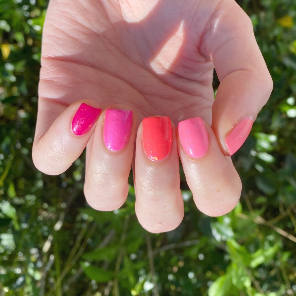 I’m kind of sad how freaking hidden the Glazed top coat turned out to be on my nails, but I feel like the direct sunlight definitely contributed to that too. Either way, I think this pink skittle look is so much fun, & it was nice to pull out so many of my China Glaze pinks for this look! I’ll be honest, I haven’t grabbed from that drawer in a while, & I kind of forgot about what was in there.
