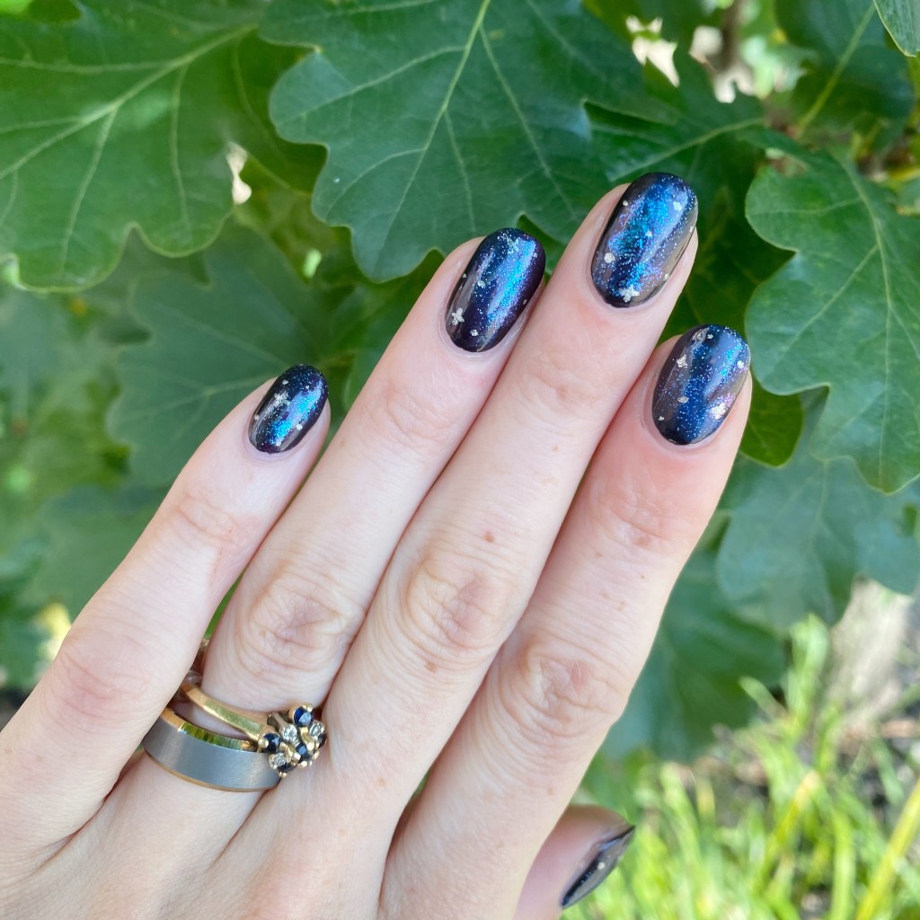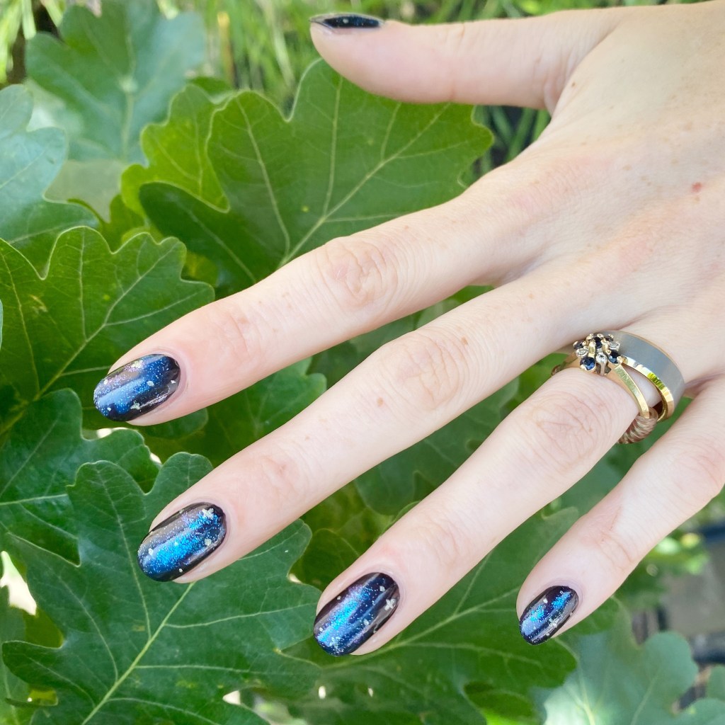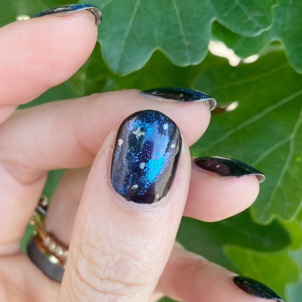 For this look, I went with the classic sponge effect for my design. I used two shades I thought suited each other well, especially the shifty base of Mermaids Have More Fun. Then I added the little details of the stars, for that fun galaxy effect. I really like how everything came together.