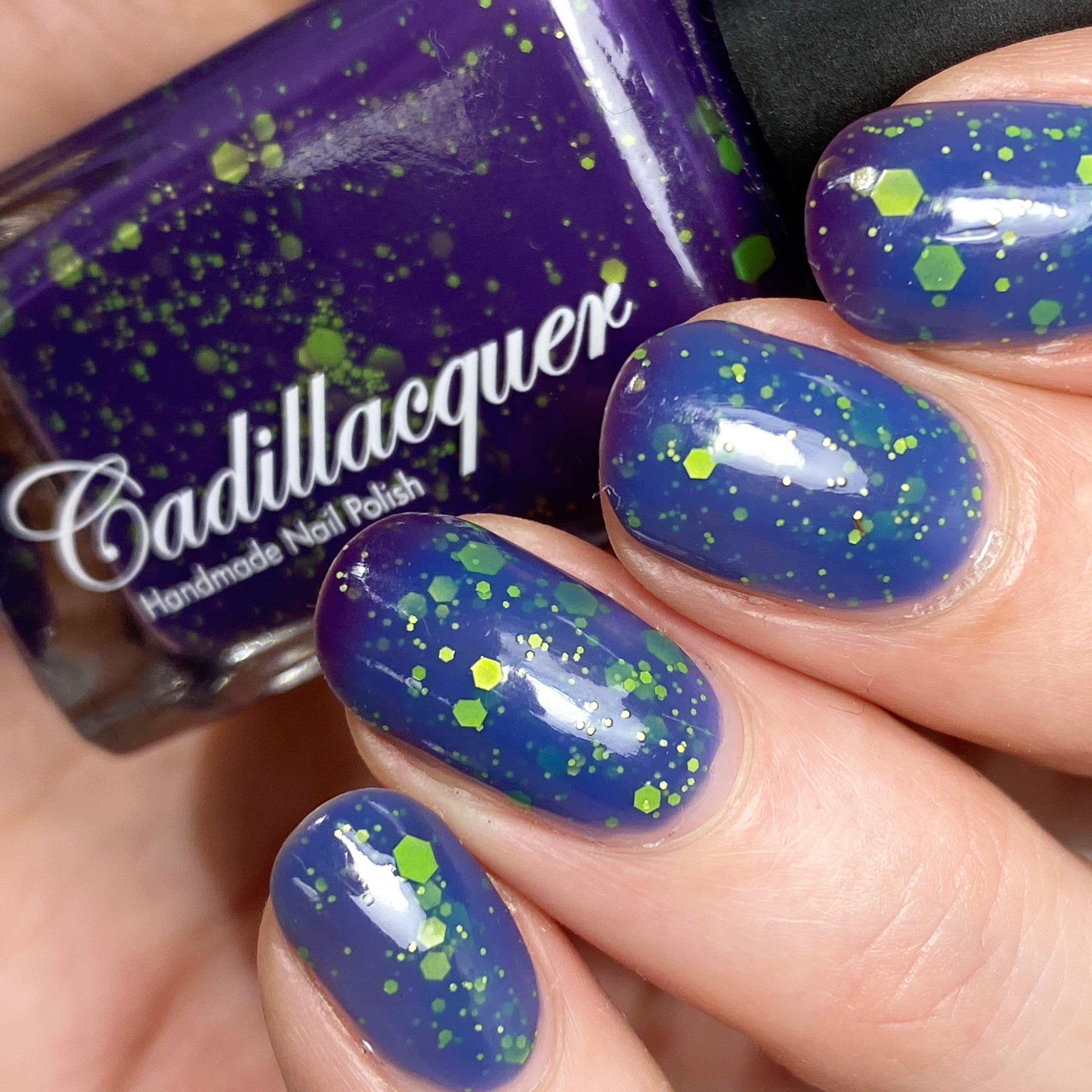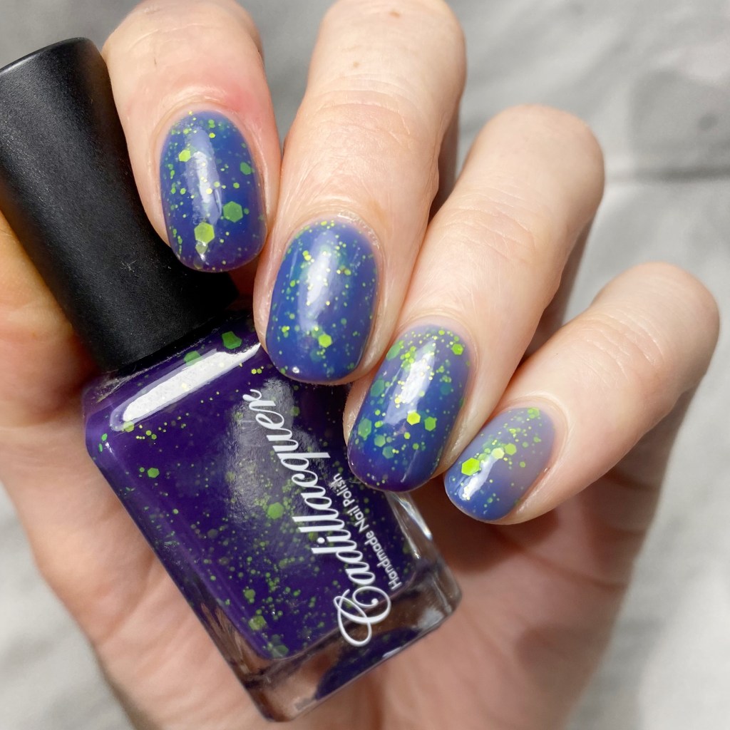 In the bottle, Cadillacquer Aghast is a dark purple with fun slime green multi-sized glitters. But the magic really happens when you apply the polish to your nails, as it’s a thermal. With warm hands, it transforms from dark purple, to lighter blue, to a pale almost sky blue. It’s very very cool.