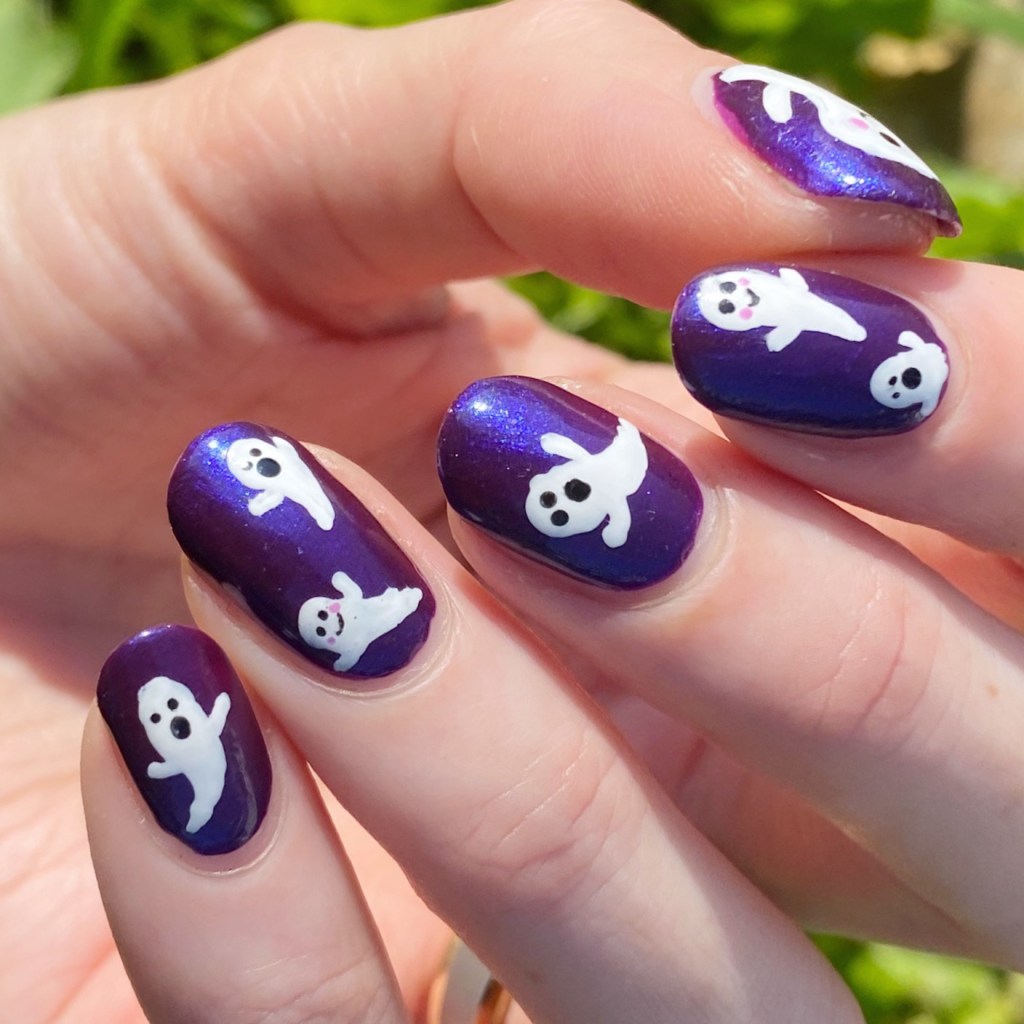 I totally didn’t realize I was going a second purple Halloween design in a row, I just really wanted to wear TGIF because of that beautiful blue glow it has! I do just absolutely adore how these ghosts turned out though — better than I could have (& did) picture in my head. Kind of cute, kind of spooky.