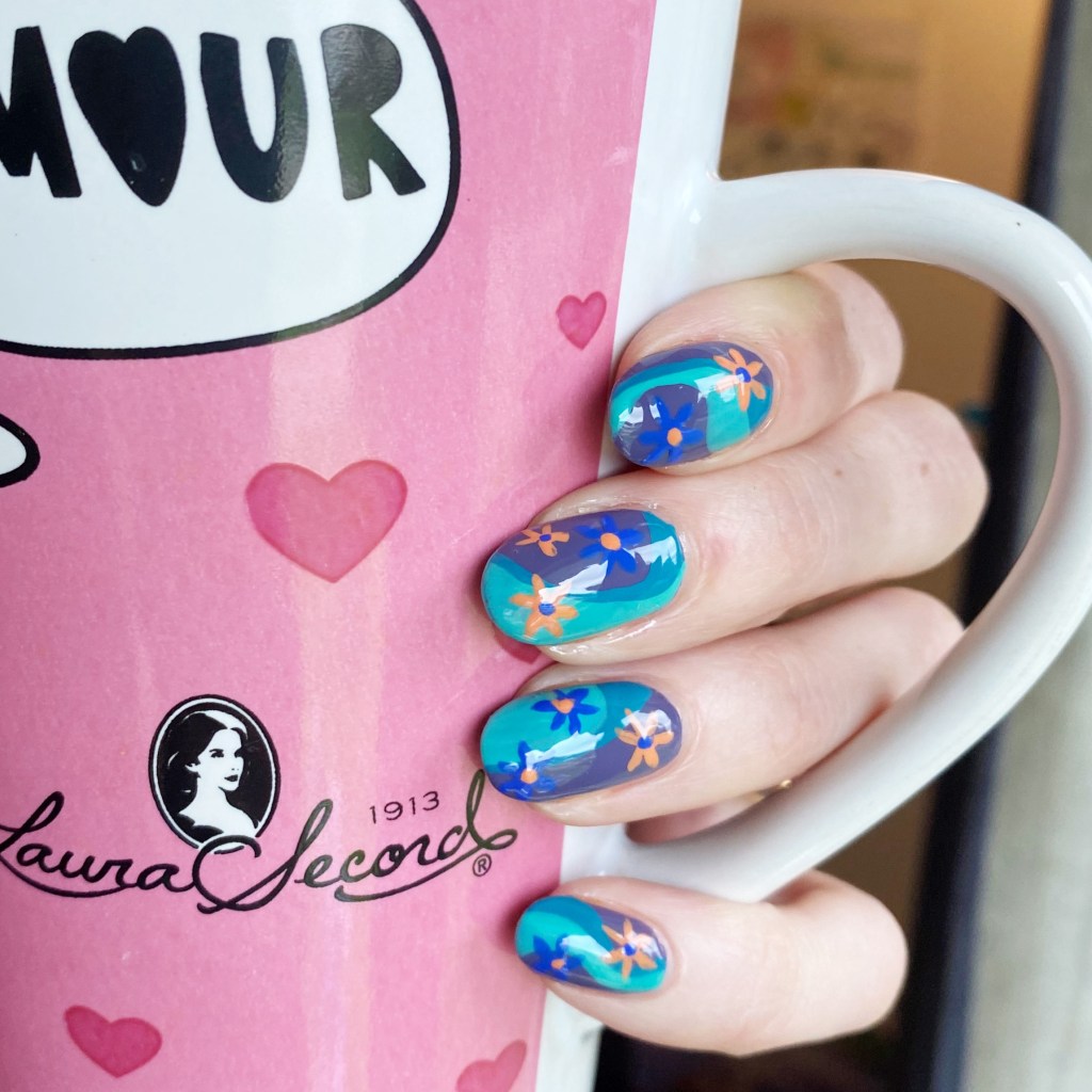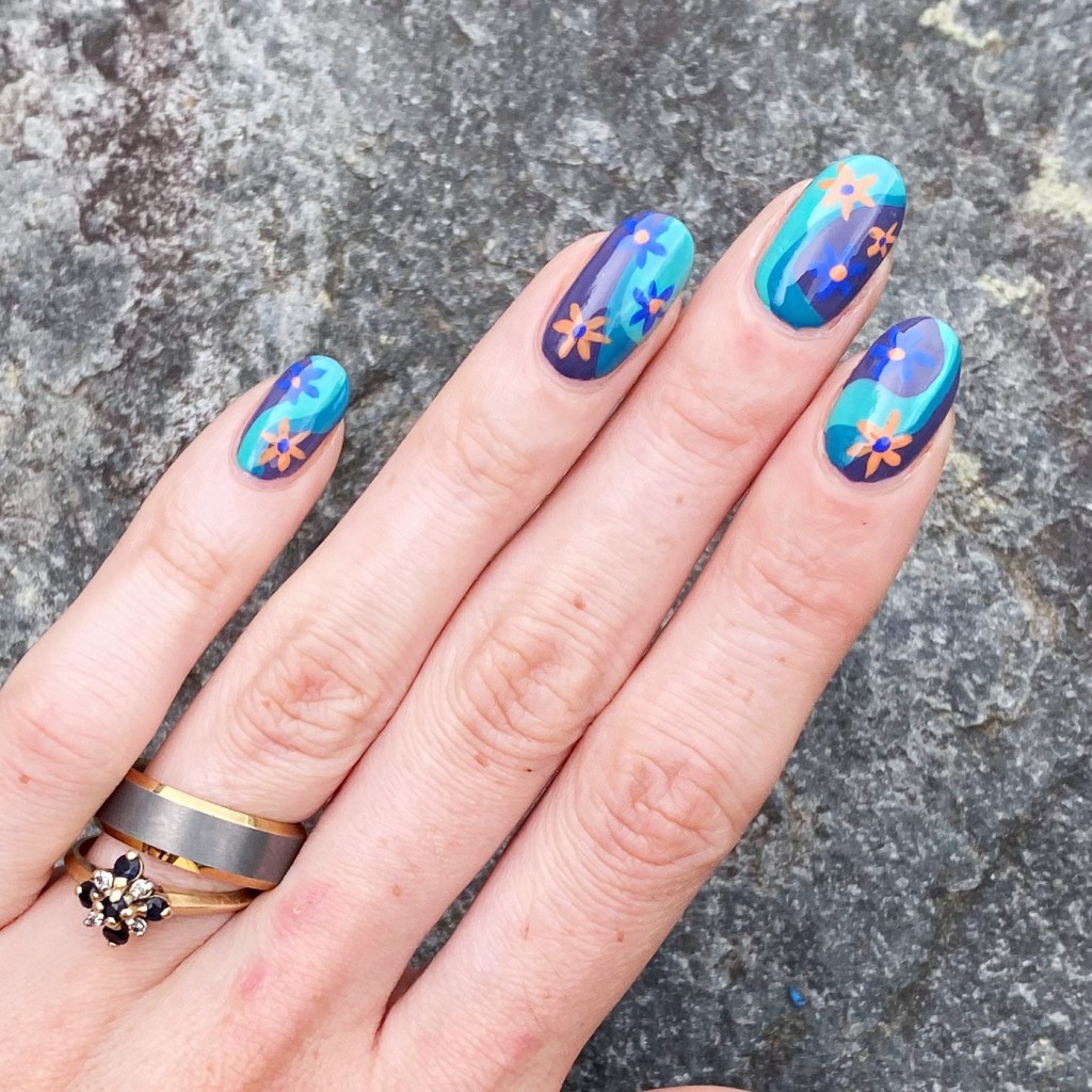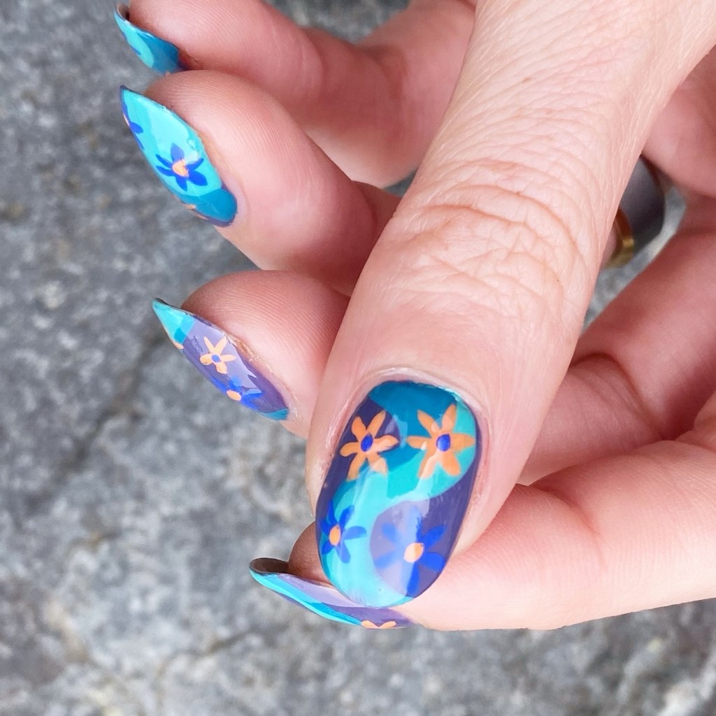 Oh man, these turned out so much better than I could have ever imagined. It’s exactly the look I was hoping it would be. I love the colours, the swirls, the flowers; it’s just as groovy as I hoped it would be! I just love it. & obviously, it’s always fun to join another group of nail artists, & see what everyone does with the prompt!