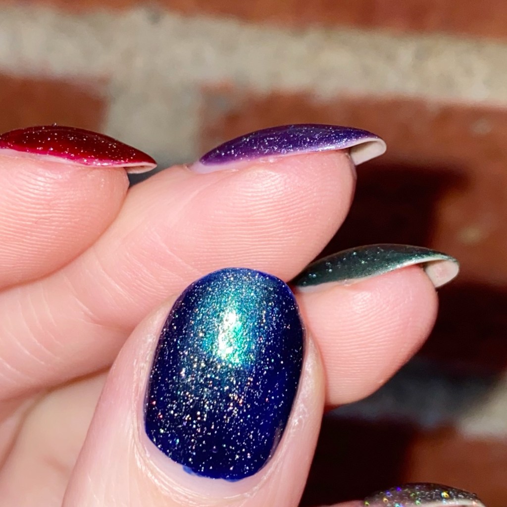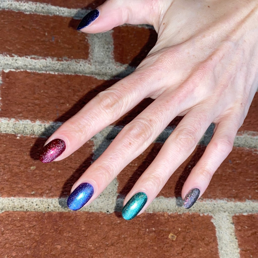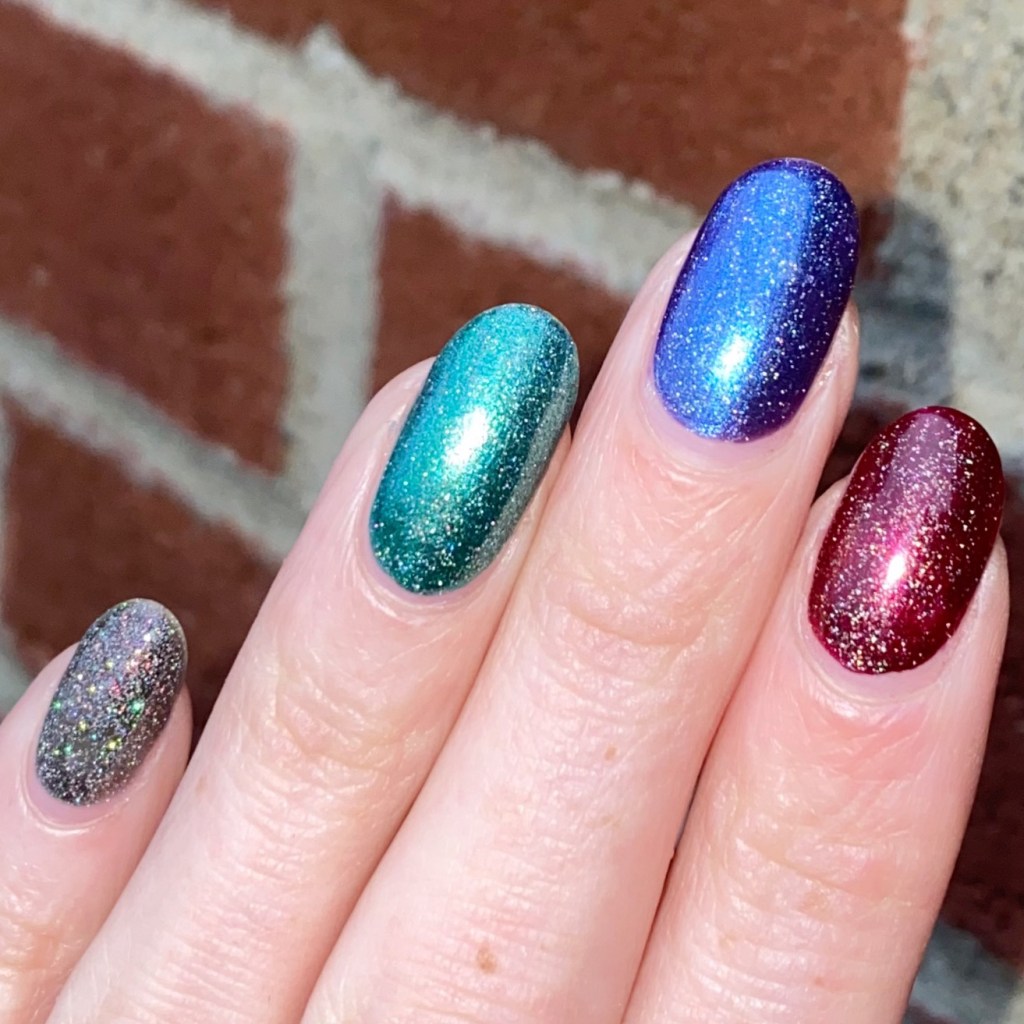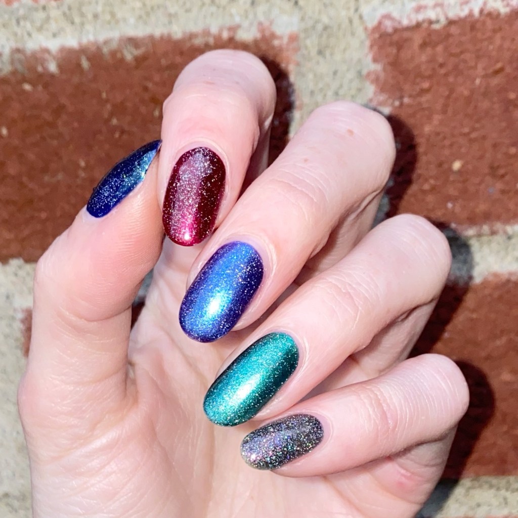 Today I’m sharing an easy November look. One of the things I feel myself drawn to this time of year is jewel tones. Even though I’m not feeling full on holiday nails quite yet, I do enjoy holiday nail polishes from years past. So I thought I would combine a few fun ones from years past into a gorgeous skittle.