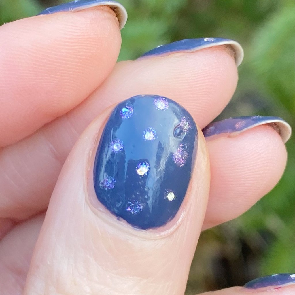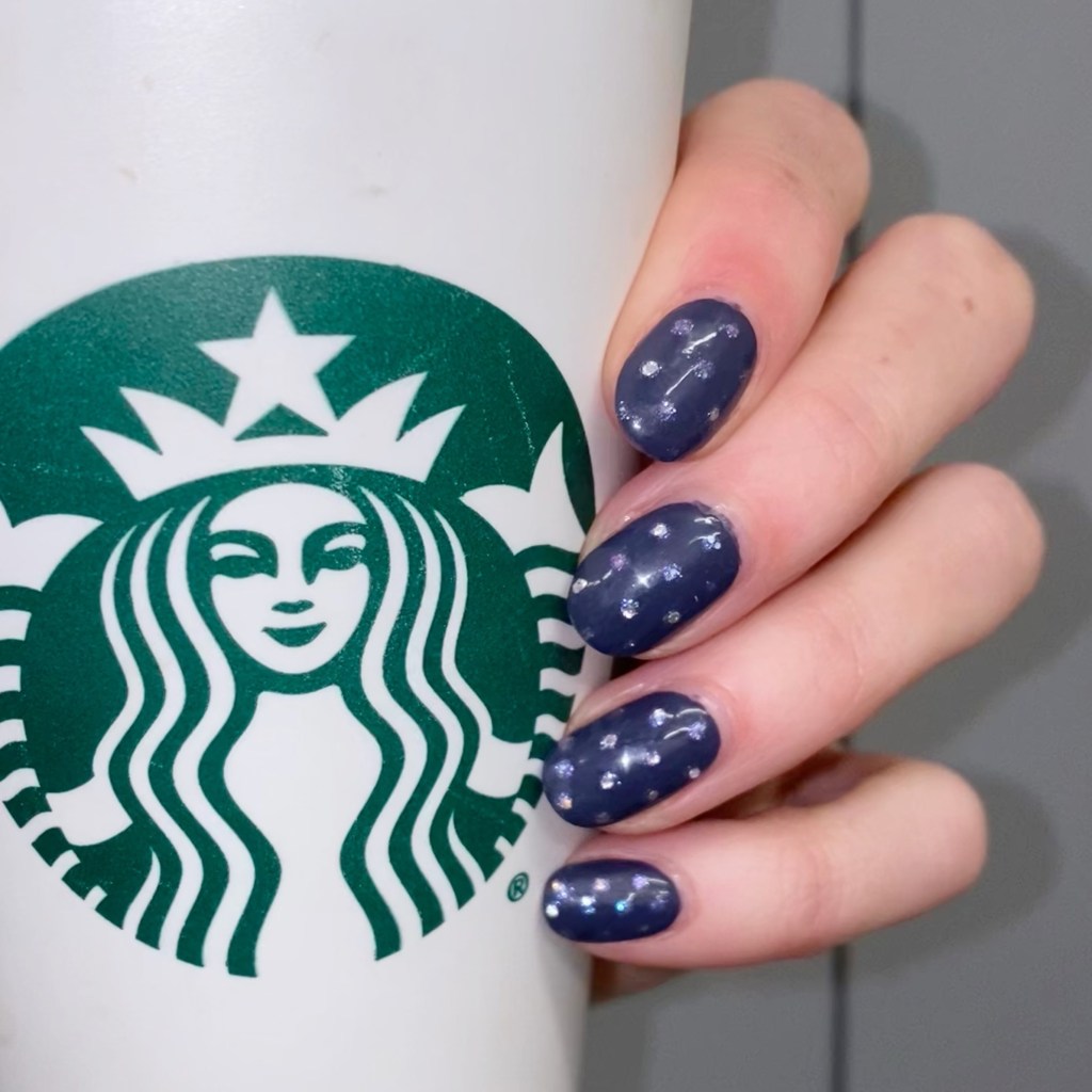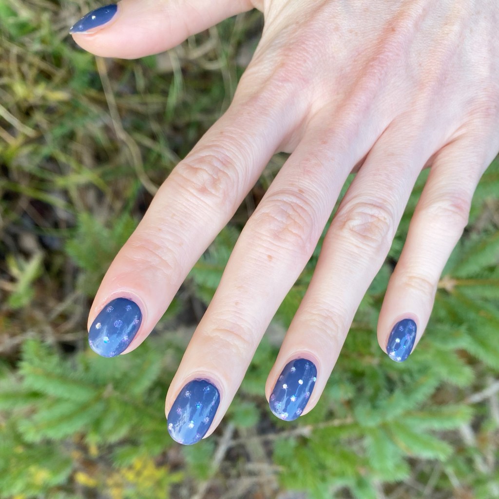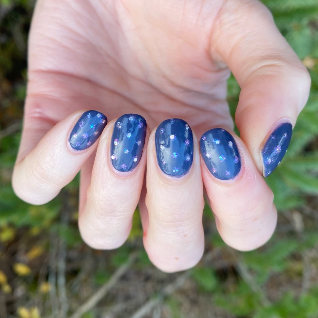 How cute are these little sparkles? I tried my best to get a little sparkle in each dot but it wasn’t always the easiest. Still looks so pretty against the darker blue base shade of Less is Norse.