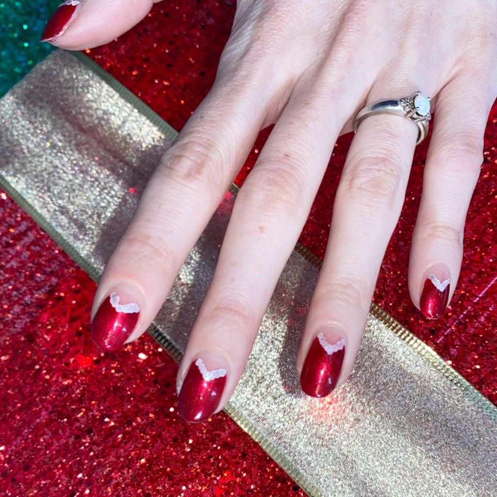 Please excuse the red staining of the negative space part of my nails β a leftover from the pink polish in my previous post. But I love these regardless β even with the dΓ©jΓ vu of it all. I do think Iβm more drawn to the shimmer & sparkle this year though. Just give it a little more Holiday Magic!