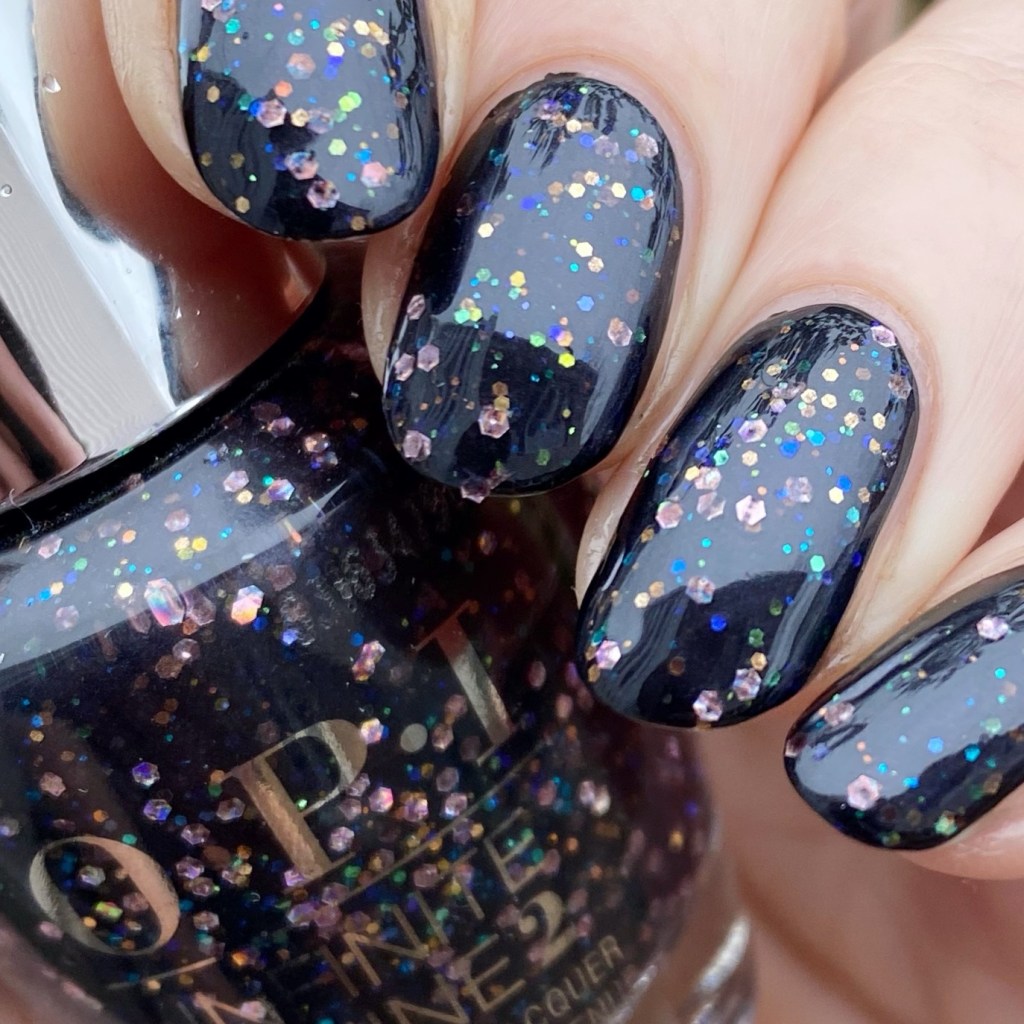 The beautiful sparkly black has a sheer almost metallic black base & an abundance of multi-sized coloured glitters — including holographic & iridescent.