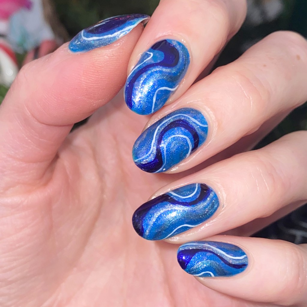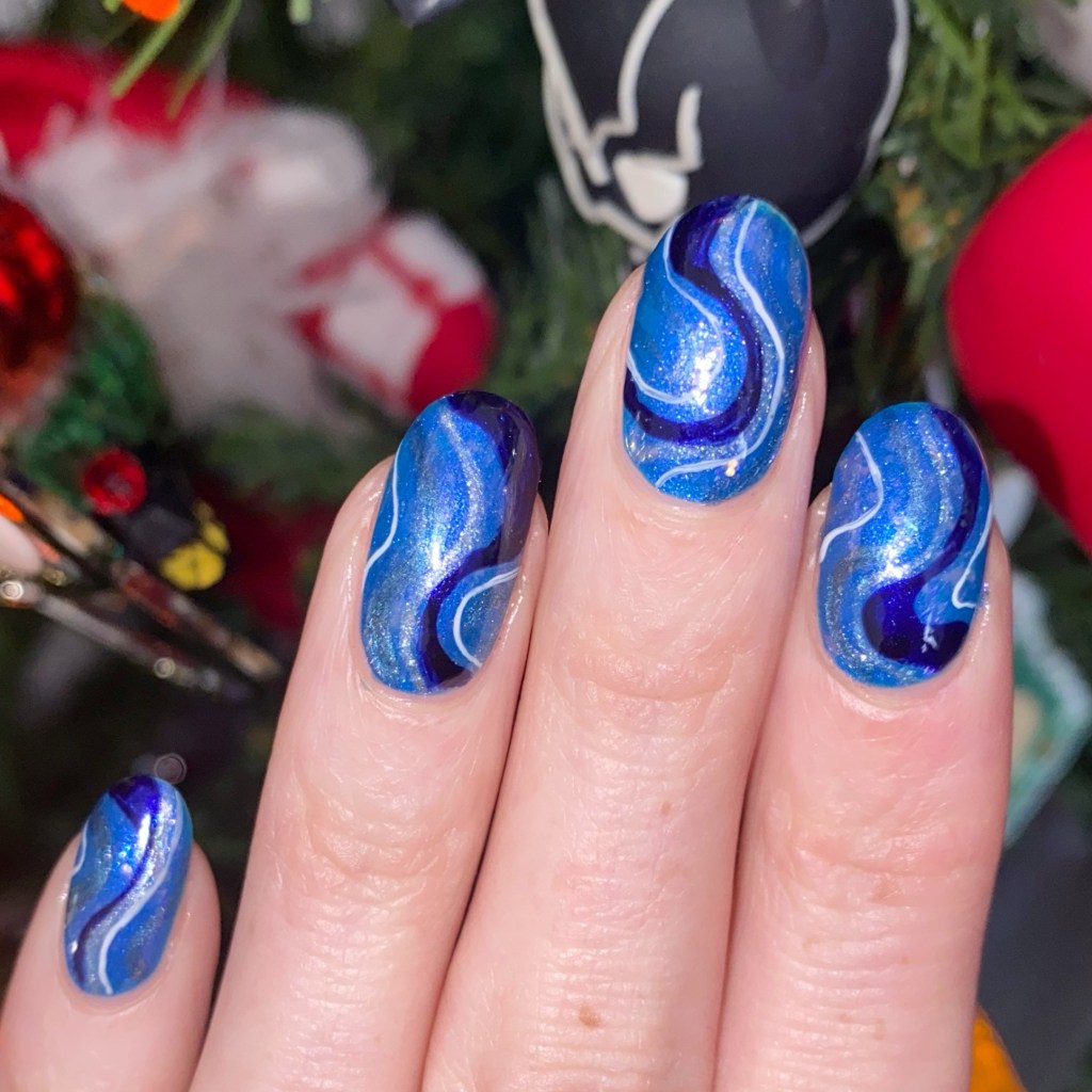 How is everyone else doing? The next prompt for Glam Nails Challenge December is wrapping paper, & I decided to create some icy abstract stripes that would have been the perfect Christmas wrapping paper! Seriously, I love all the Christmas themed papers you can find ā we wrapped a lot of our kids gifts in Nightmare Before Christmas paper this year ā but personally I would love to find a gift under my tree wrapped in this swirly designs.