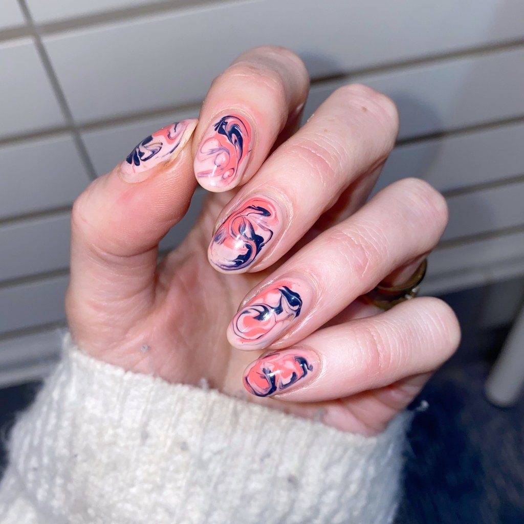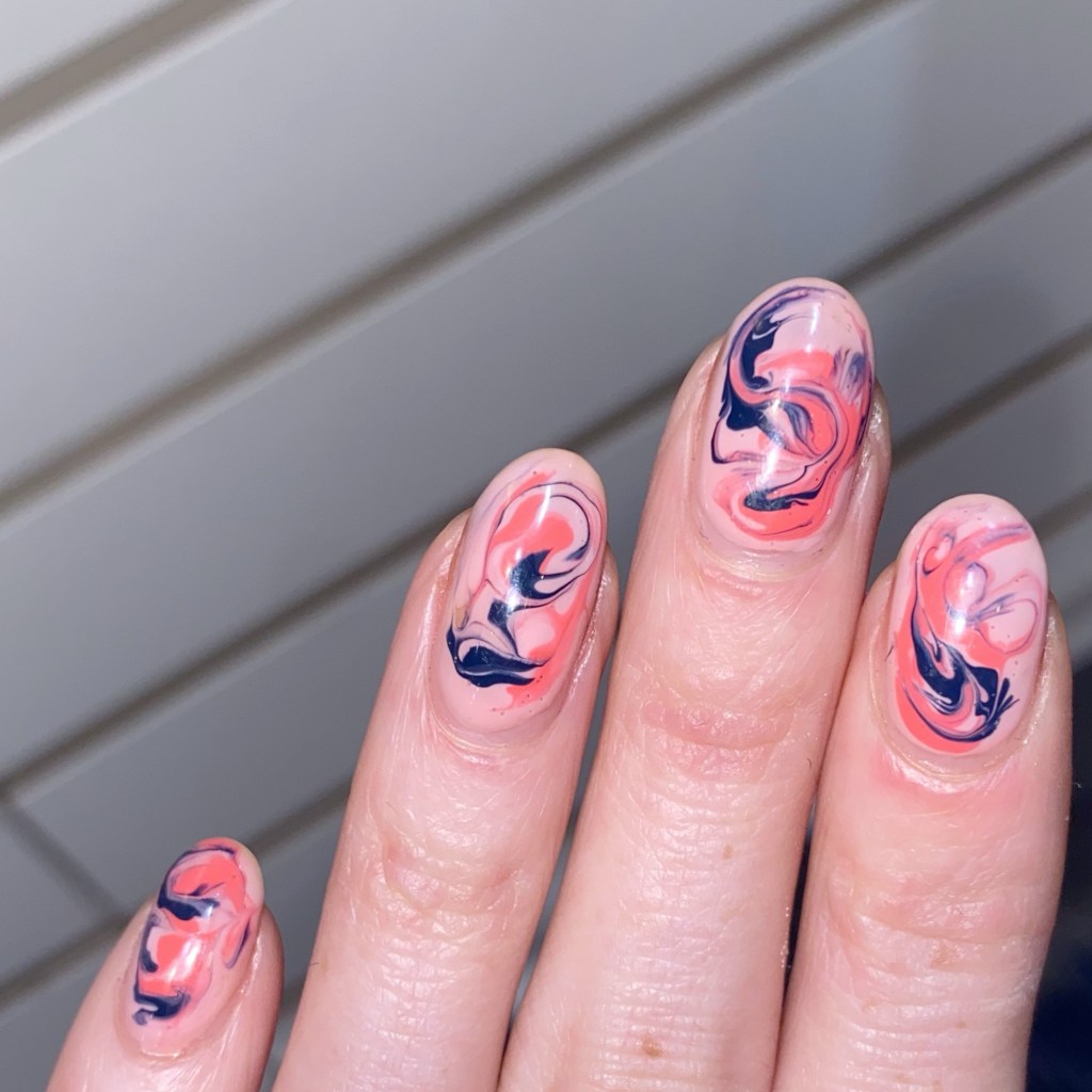 My idea was to do a sheer-ish base, with a neon drag marble. But then I decided to go with a little navy blue & sort of neon. It wasn’t originally the planned design, but I think it turned out nice. Drag marbles are just some of my favourite easy designs, & they look good on any nail length (which I love).