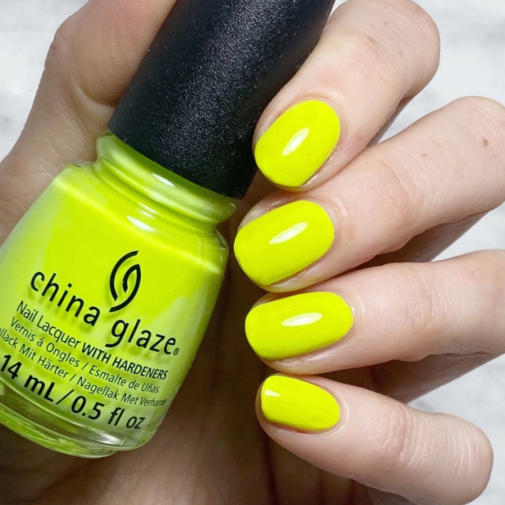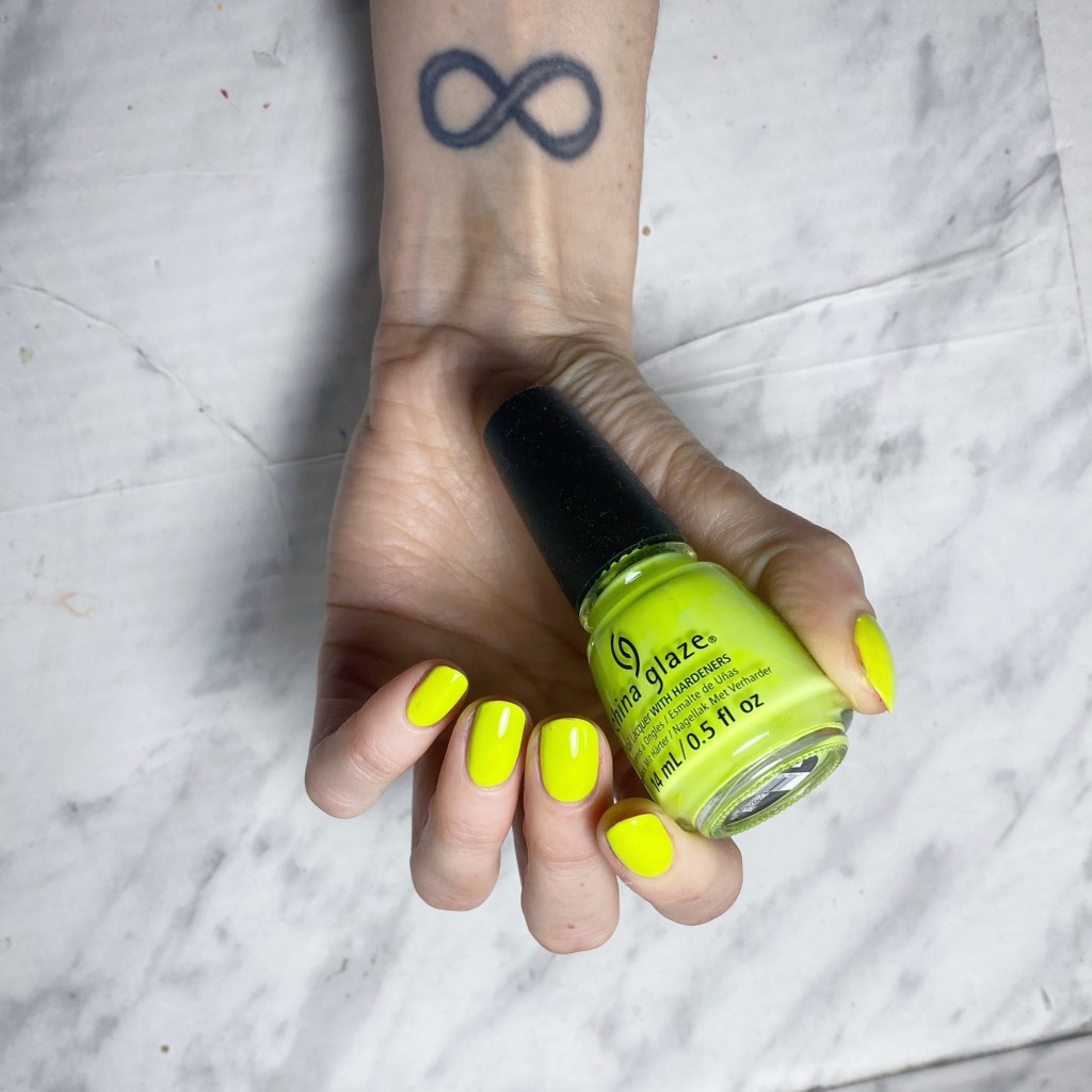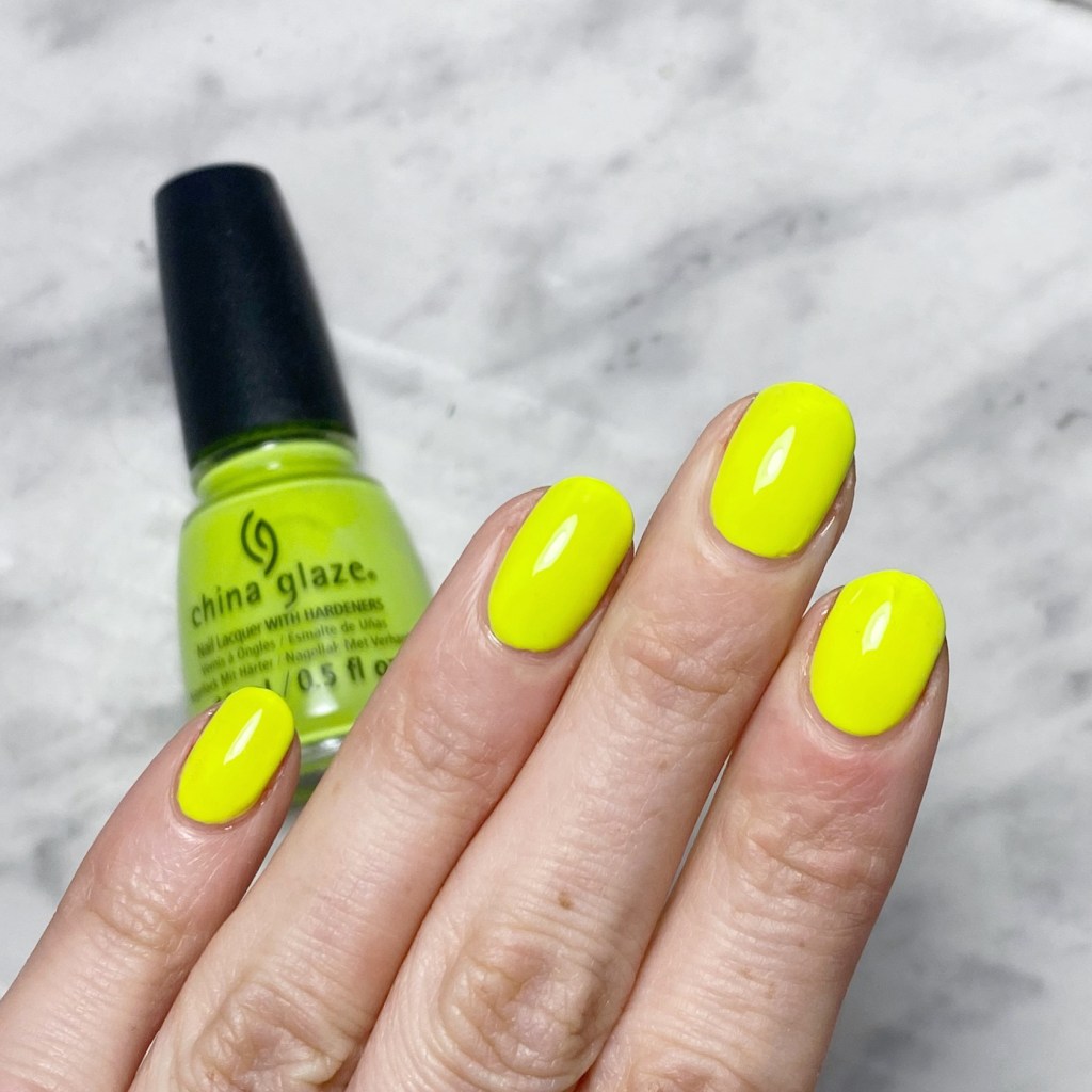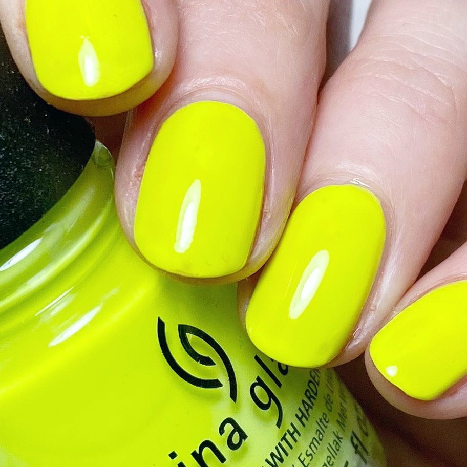 The polish itself is a funky highlighter yellow, with just a touch of green to it. If I had to compare it to anything, I would say it reminds me a tennis ball for sure. & how Summer-y is that?
