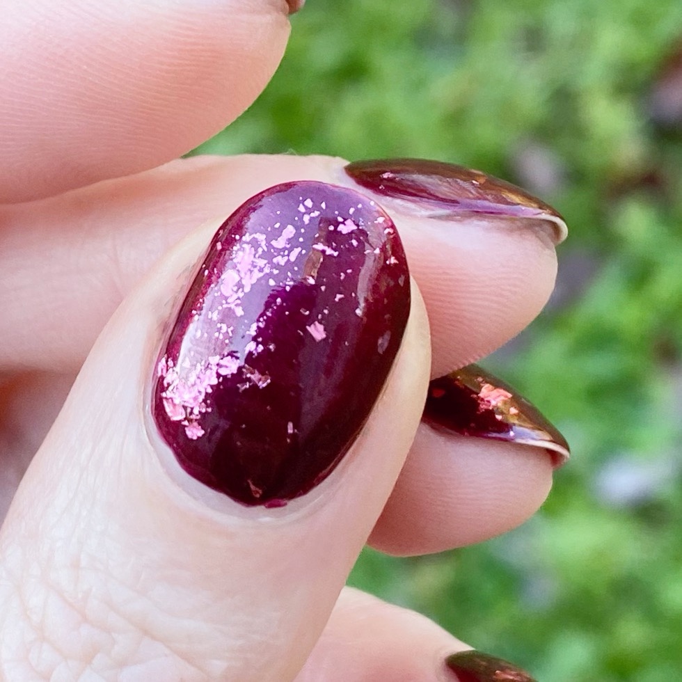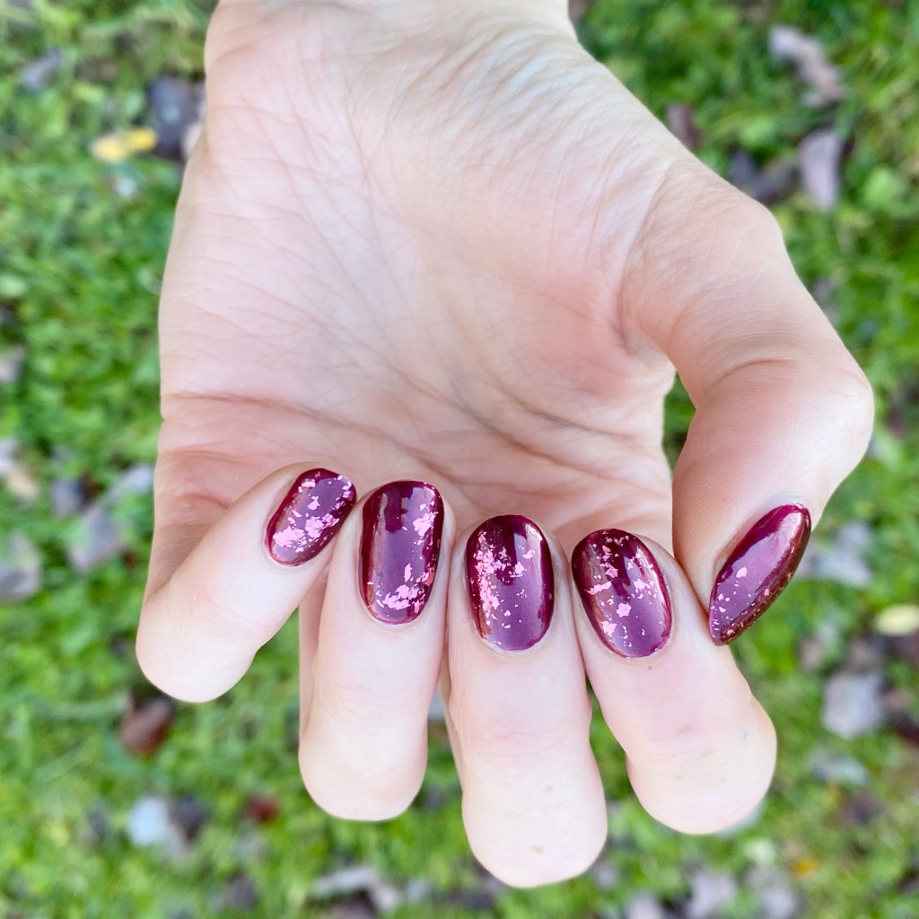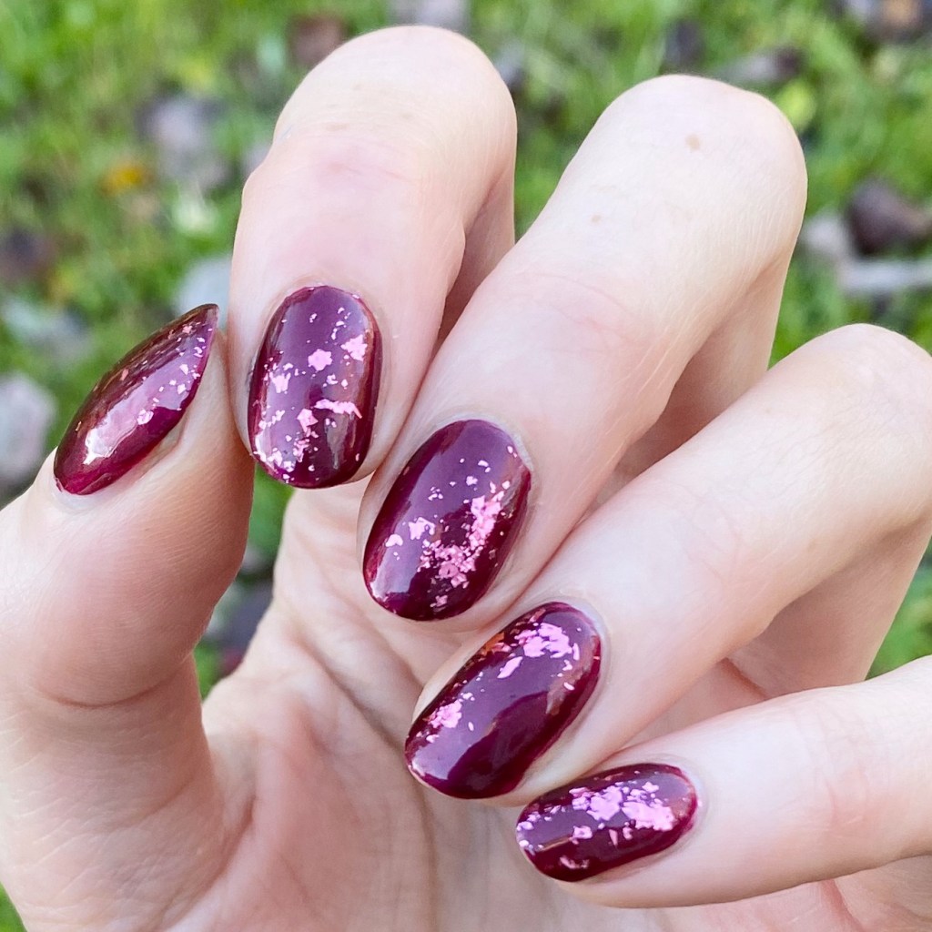 Today I have another simple but beautiful design to share with you. I was already wearing this beautiful berry polish, & decided what it really needed was some glitter placement. My original plan was to do gold, but when I was browsing through my box of glitters I saw this beautiful pink flakie glitter I was gifted c/o: NailStuff & decided it would look just stunning over this base!