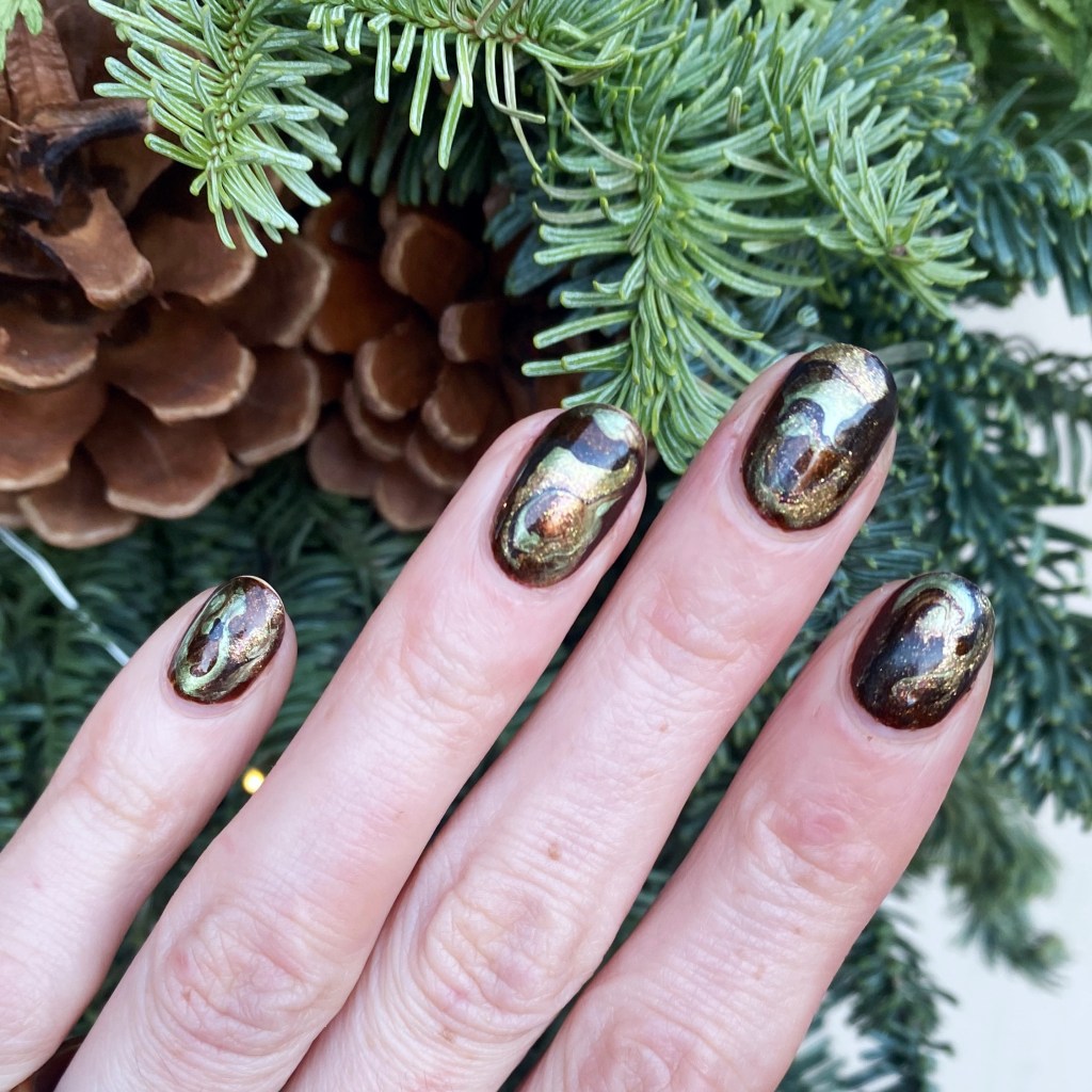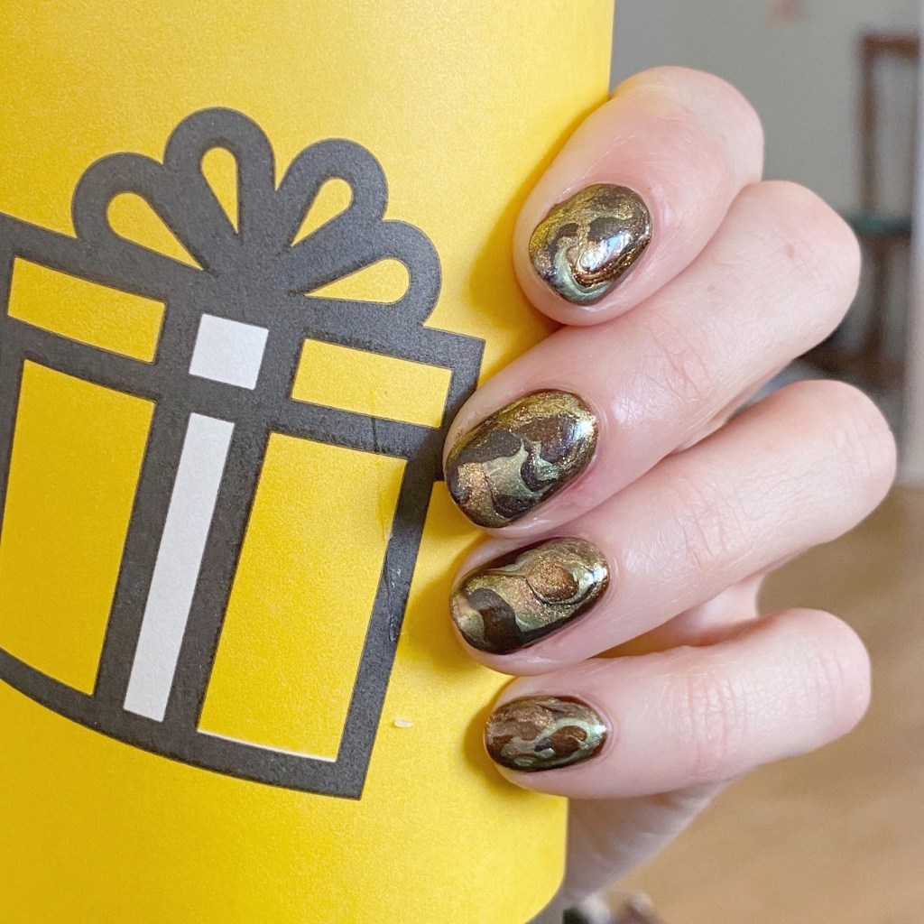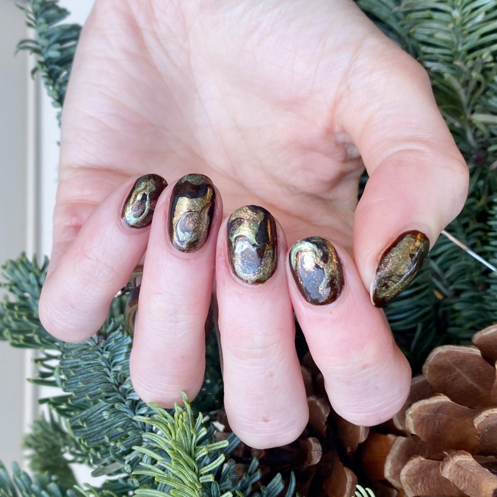 So I tried a bit of a different technique for this marbling, with a wider nail art brush (like the side of a clean up brush) versus the skinny dotting tool I usually use, & I like the effect it gave me. Kind of reminds me more of a real stone. Sometimes I find with a dotting tool I end up muddling my marble a bit, but this way didn’t do that which I really like!