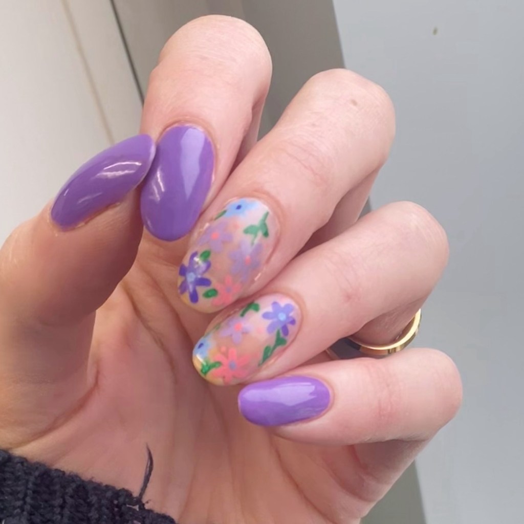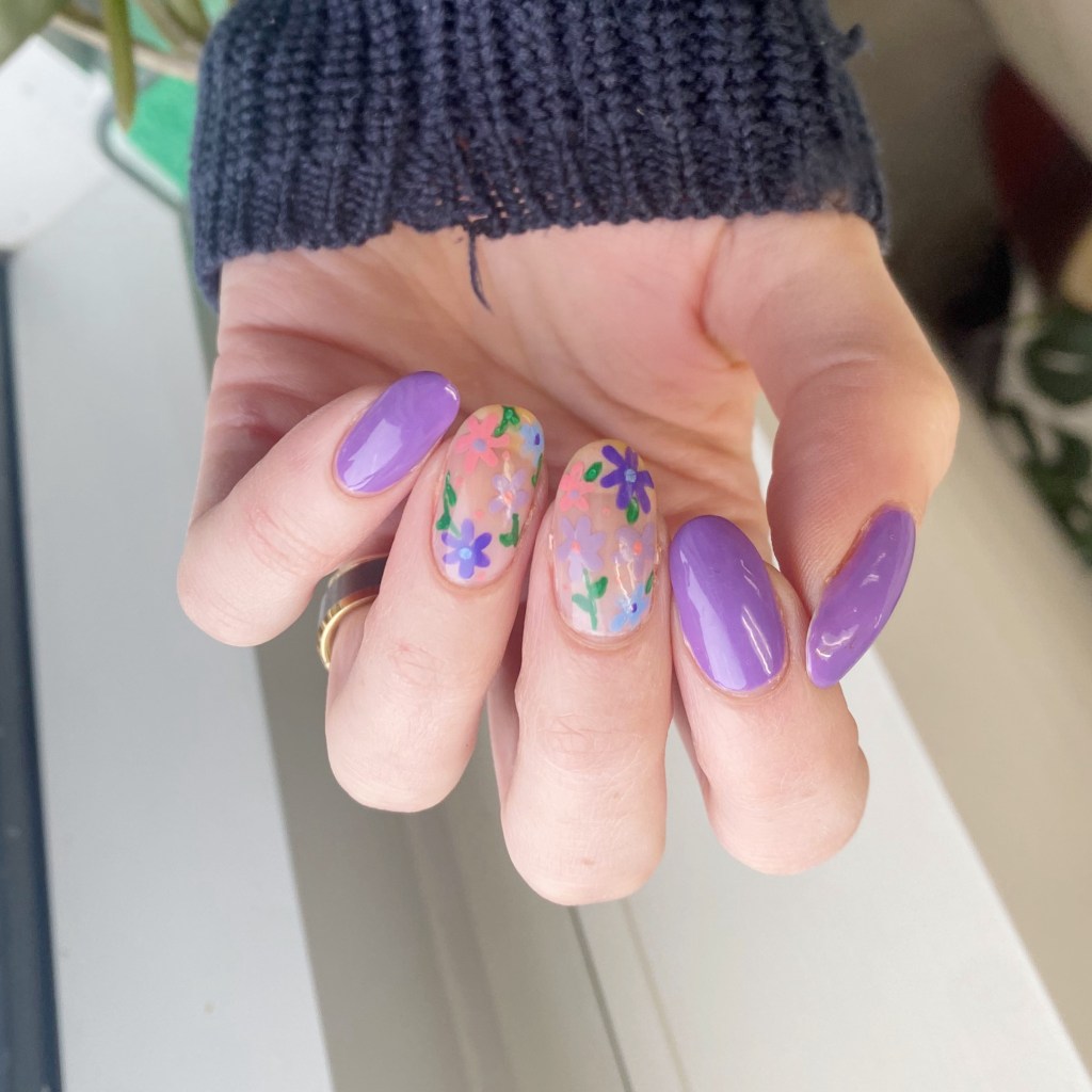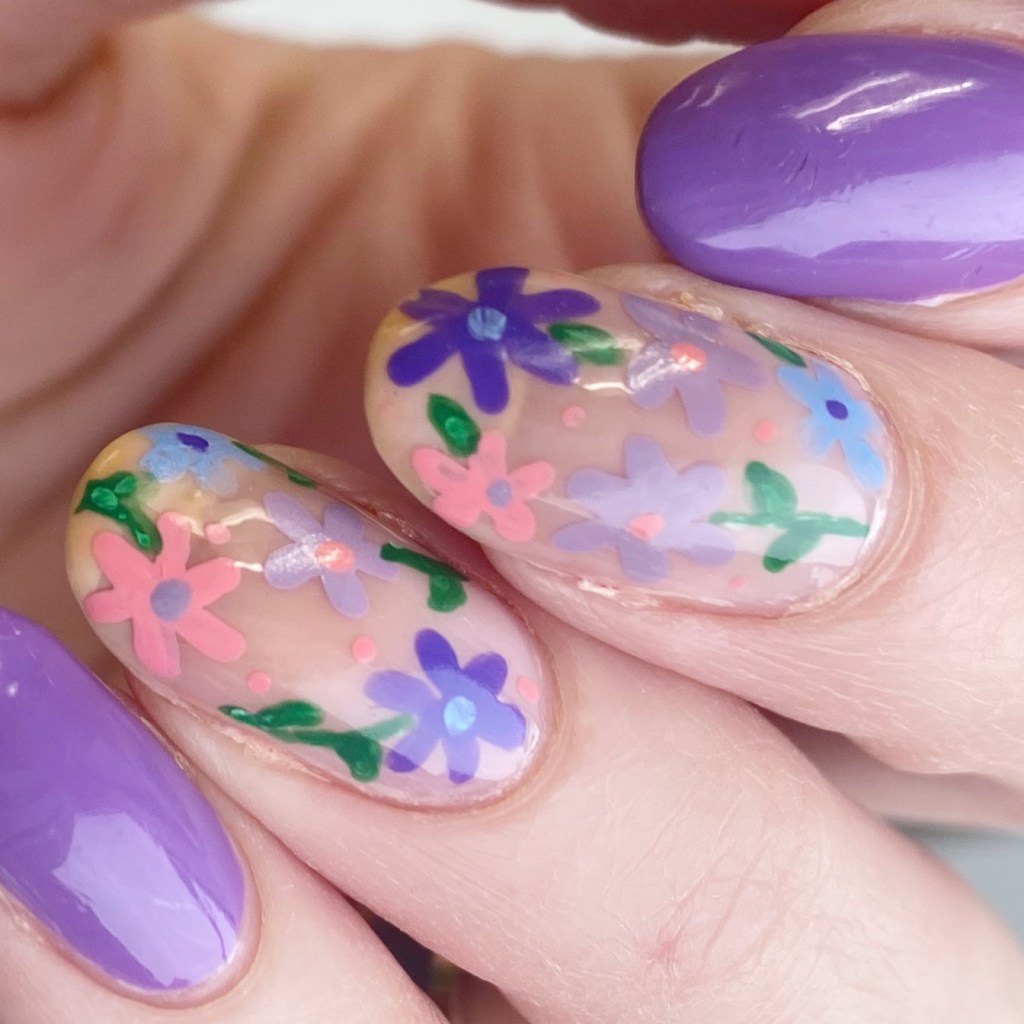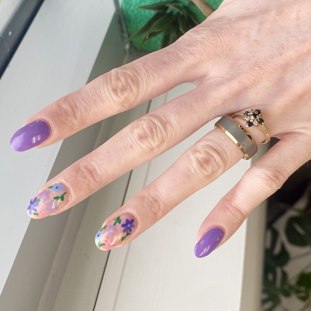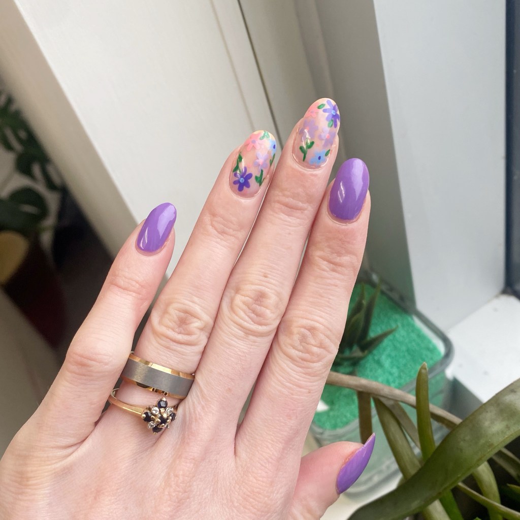 I love floral nails so much! These were done while I was away from my stash, so I used acrylic paint for my floral instead — because that’s what I had available. I also didn’t have my usual favourite nail art brush from NailStuff, but I think I this look really came together for a beautiful Spring look. I love love love Posh Petal as the sheer base for my flowers, & I think it works perfectly for this naked, but not really naked, effect.