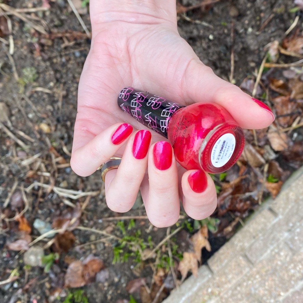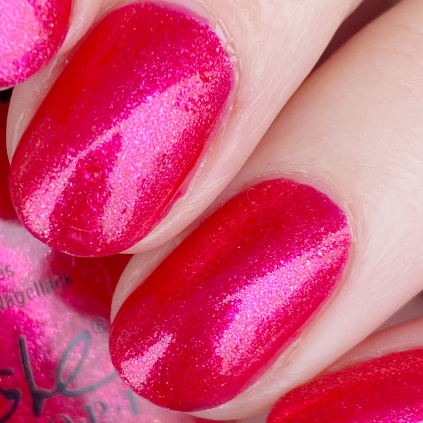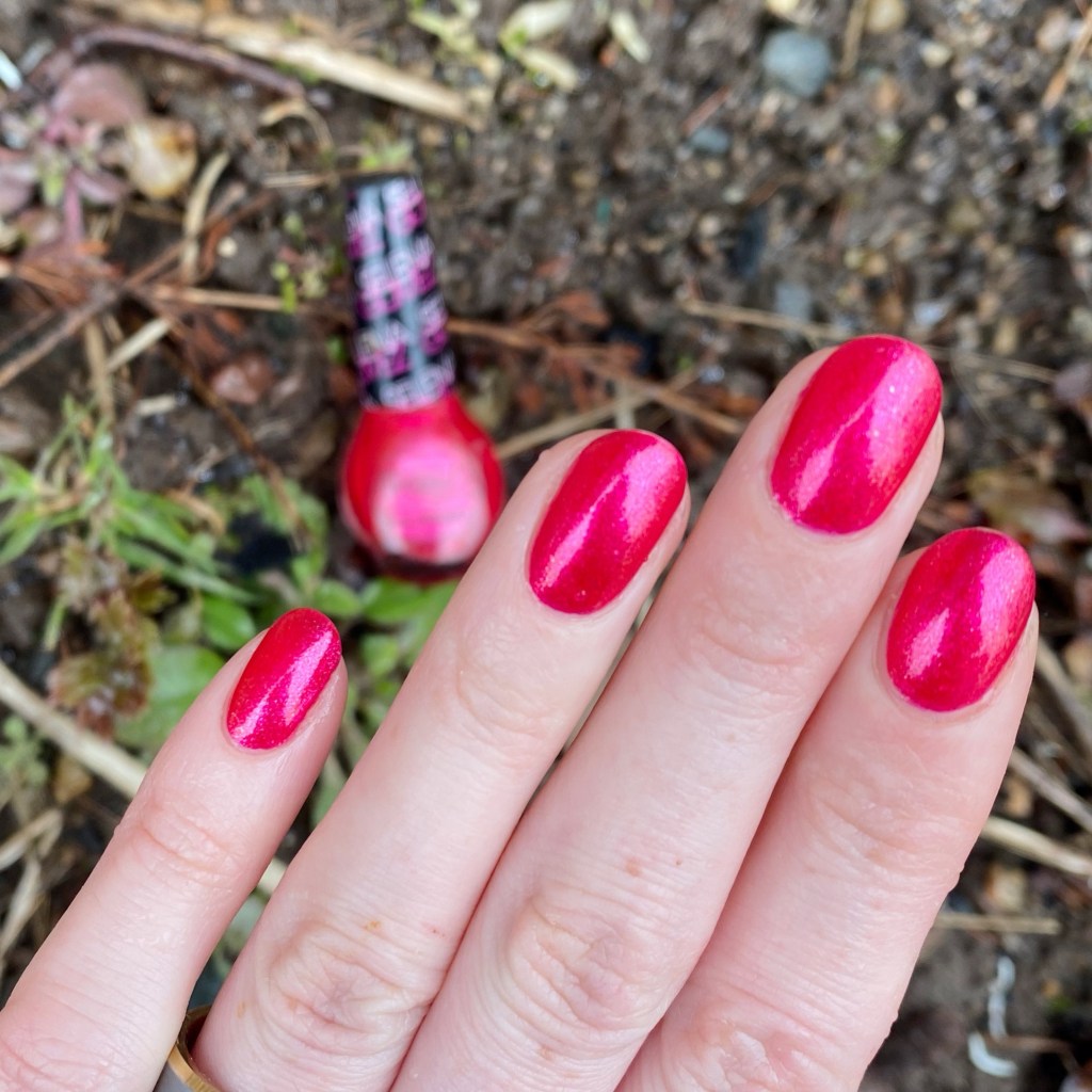 The formula on this one was slightly thin, but not too thin it made it hard to apply. 2 coats built to this perfect opacity. The finish though — the finish is my favourite. It’s this gorgeous glass fleck finish. Also I love that it sort of looks pink, but also sort of looks red.