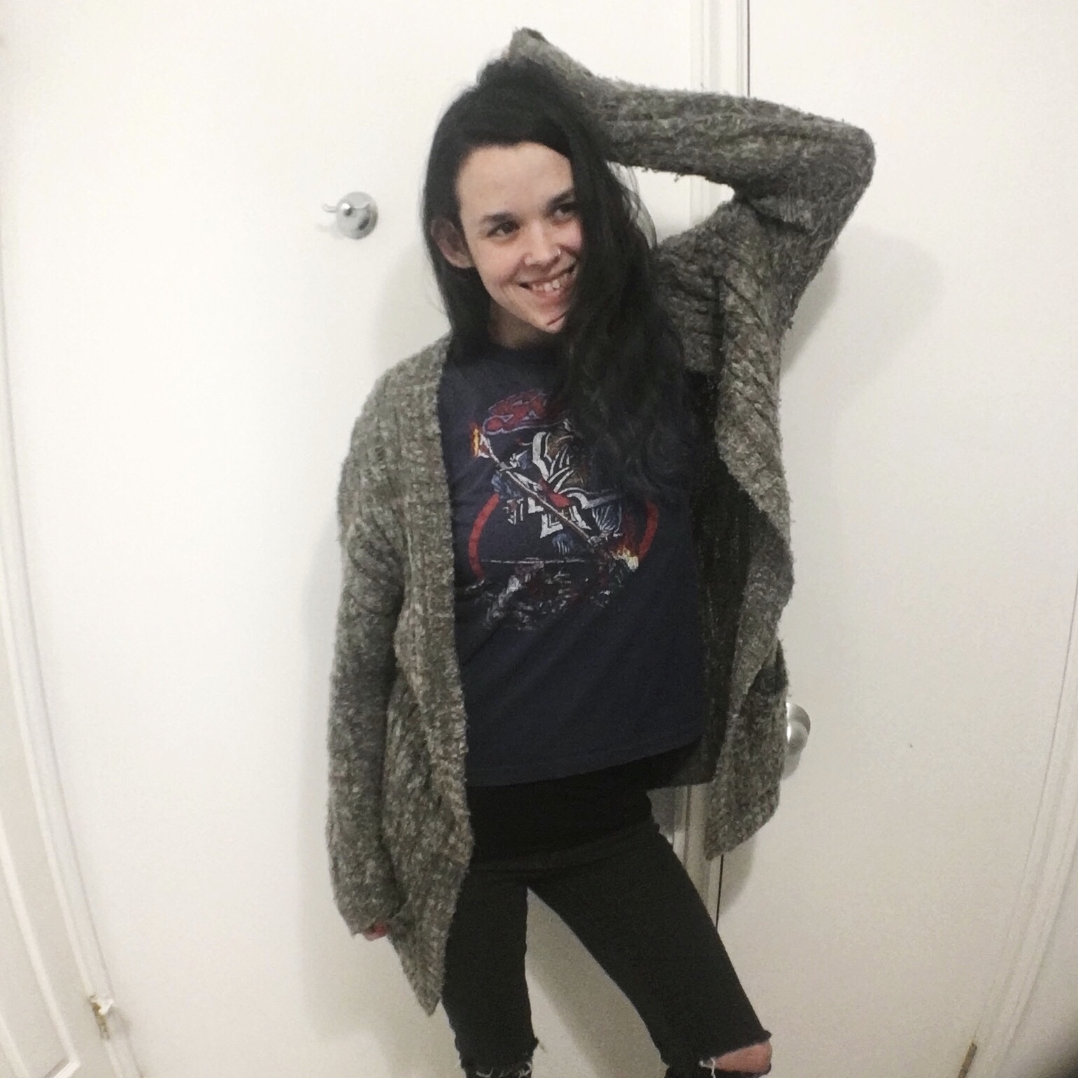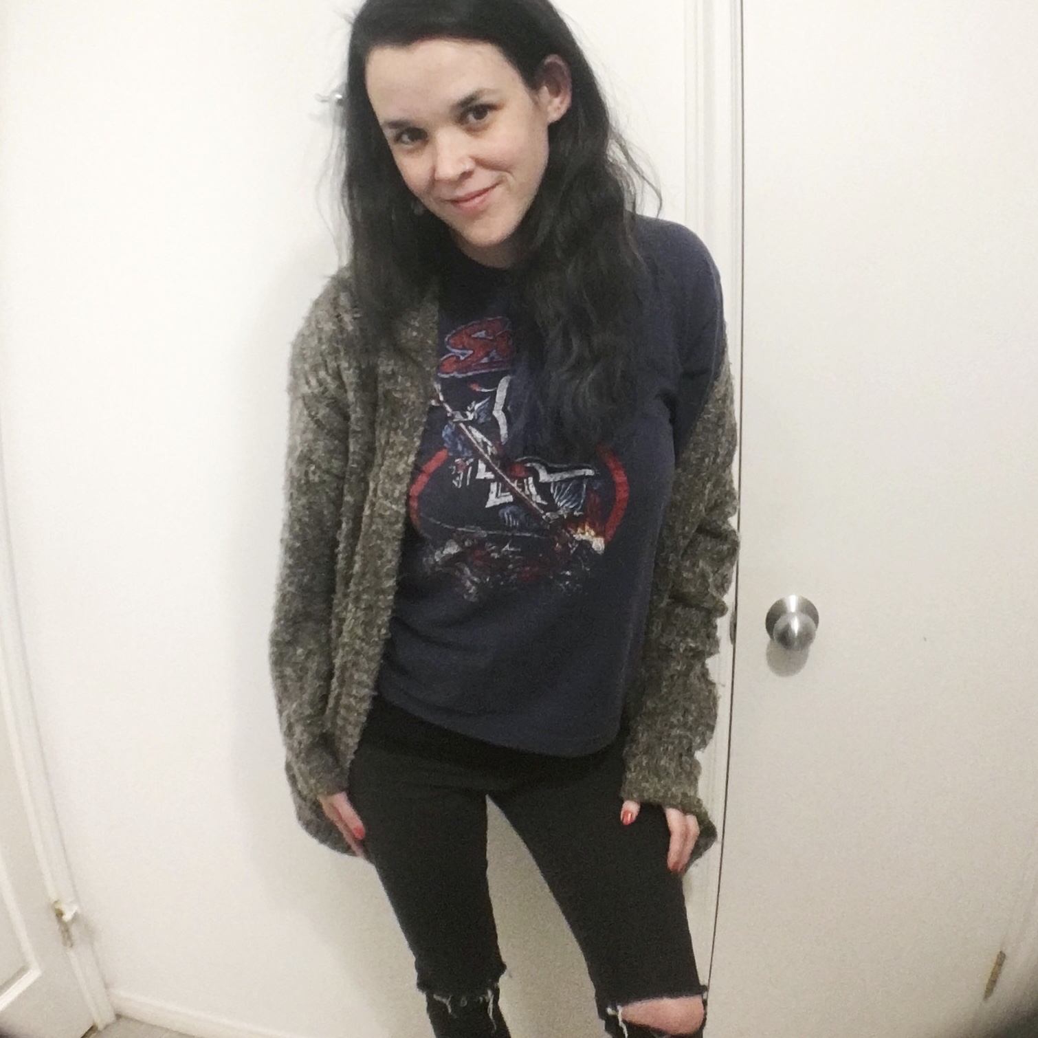 Thrifted O’Neill Brand Floral Peplum Tank. Light Pink Stitches Cardigan. Dark Levi’s slimming skinny jean. Claire’s bow headwrap — Similar Item Here. Not Pictured: Ardene Knee High Black Studded Boots.