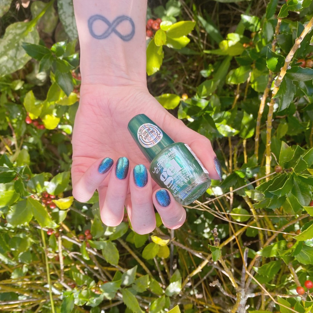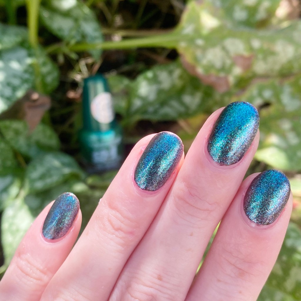 The shift is also gorgeous — there are flashes on blue & green, as the main ones, but you also get purples as well. Very mermaid-y, which I love, but the jewel tone is perfect for this time of year. I’m not usually someone who reaches for green very often, as well all know (& I’ve said plenty of times) but a shade like this with the multichrome shift is definitely one I will wear. In fact, I wore this manicure for almost 5 days!