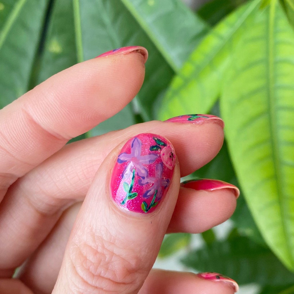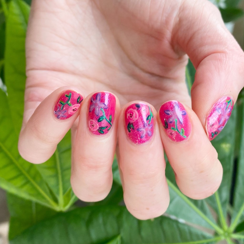 I feel like this week I’ve very much been on a purple & pink kick. They’re usually the shades I have hanging around on my nail desk, so I guess that is why I grab them most frequently. I just adore how my floral turned out though, & I’m really proud of the finished product. I also think the hot pink base is especially fun. Let’s bring on some brighter days!