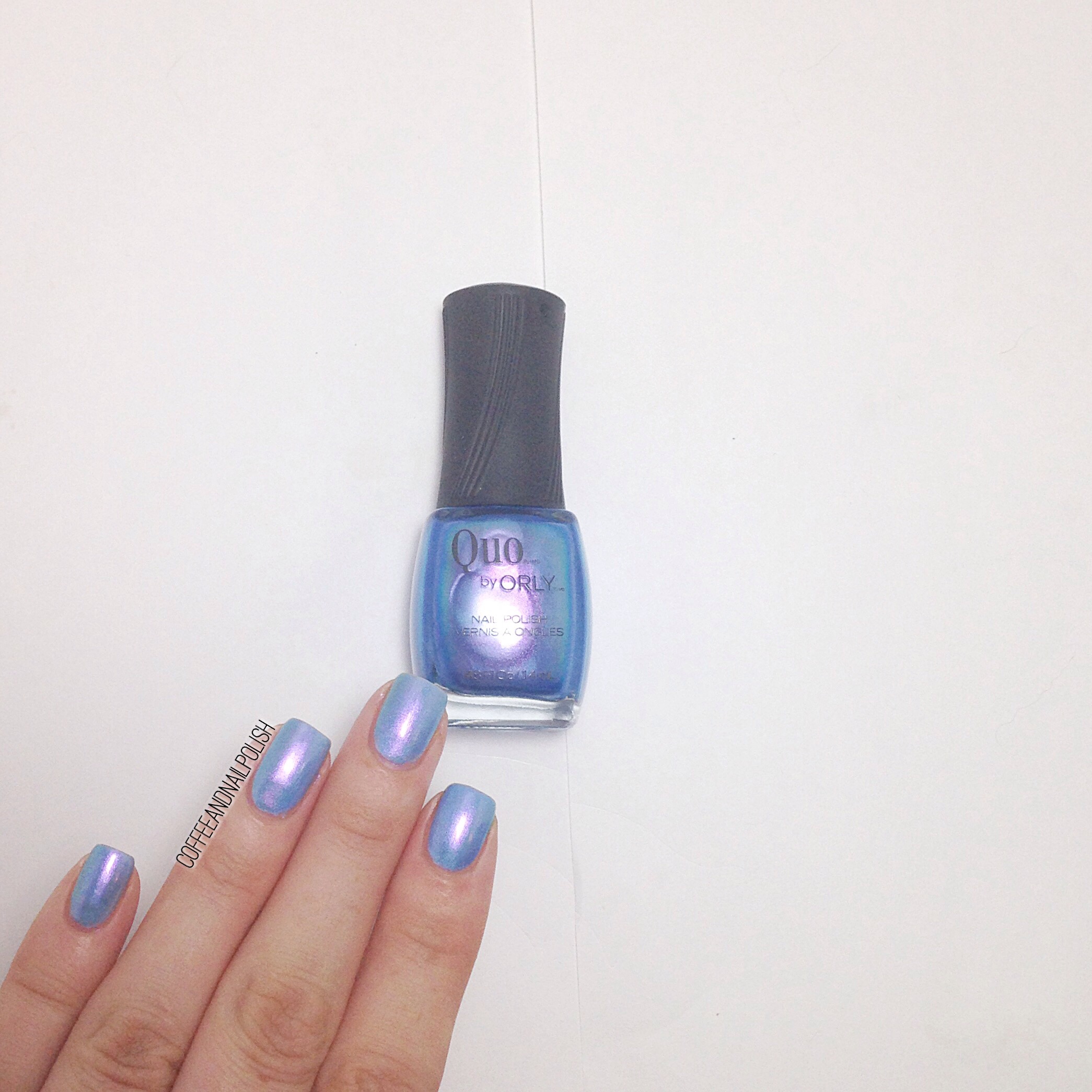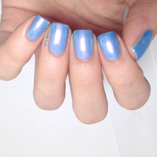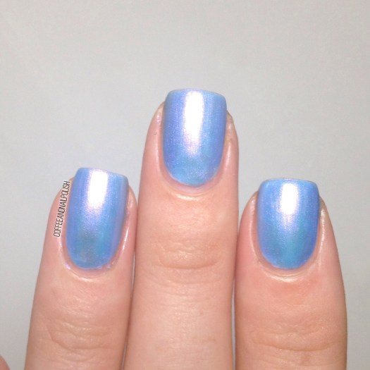 As you can see from the bottle, the base of the polish is a sheer-ish green blue with iridescent blue shimmers. You could definitely try & build it up to opacity, but I’m not sure how many coats that would be. If I had to guess, I’d say you’d be looking at least 4. & besides, I really find these shades work best with undies–it makes the change that much more apparent. You can see above that it flashes between blue & pink/purple depending on how you move your hand.