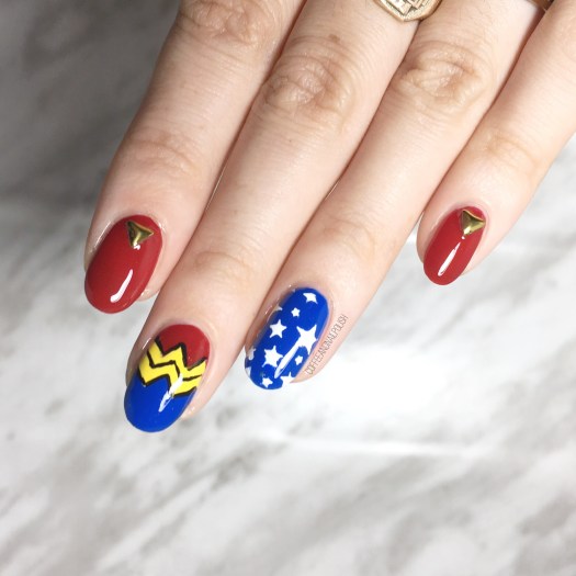 I love, love, love how these turned out. I had a bit different idea going into this mani but even though these are different than who I originally planned, I think they turned out WAY better than what I was thinking I was going to do… & say Wonder Woman much more! I was super scared to attempt that W symbol, but I think it turned out great. & these are going to compliment my costume perfectly.