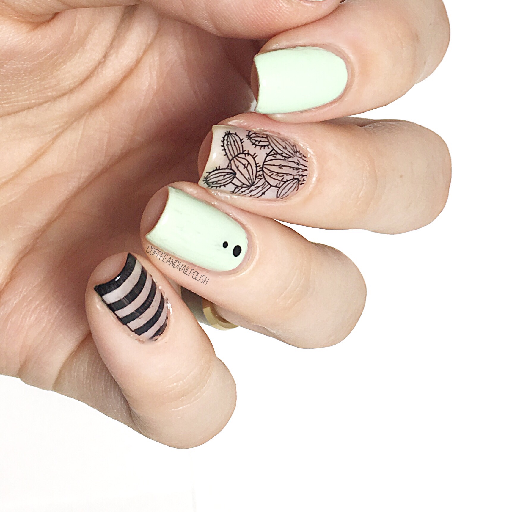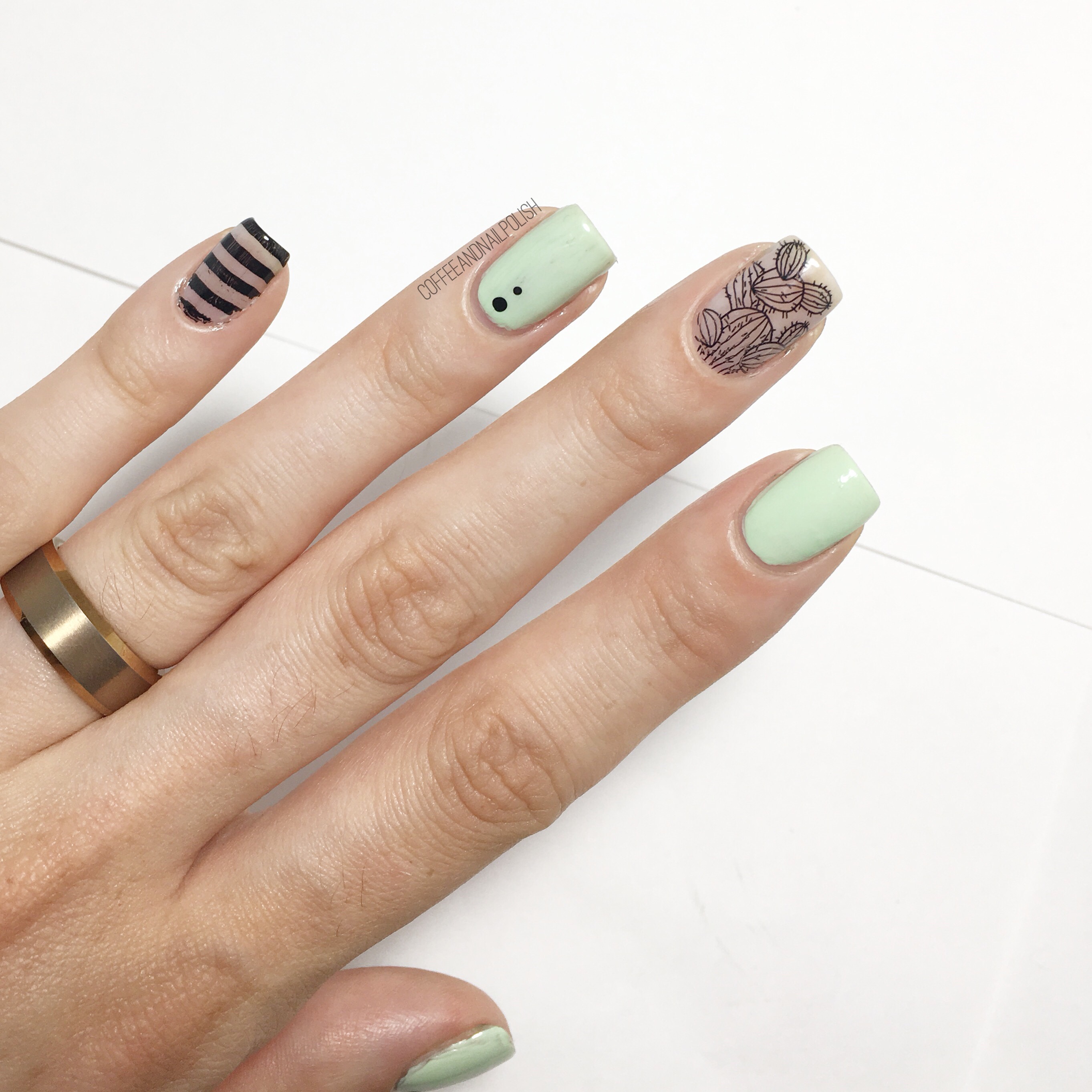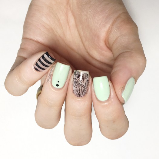 For this particular design, I stamped both the cactus pattern on my middle finger & the stripes on my pinky. The black stamping polish was definitely the best for picking up the images (I tested with some of my other blacks & couldn’t pick anything up). You definitely have to move quick though–if you wait too long, you won’t pick up anything! But even with all the work, the end result is gorgeous. & I couldn’t stop staring at my nails.