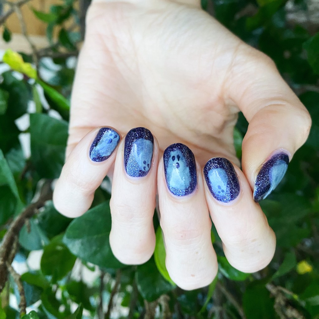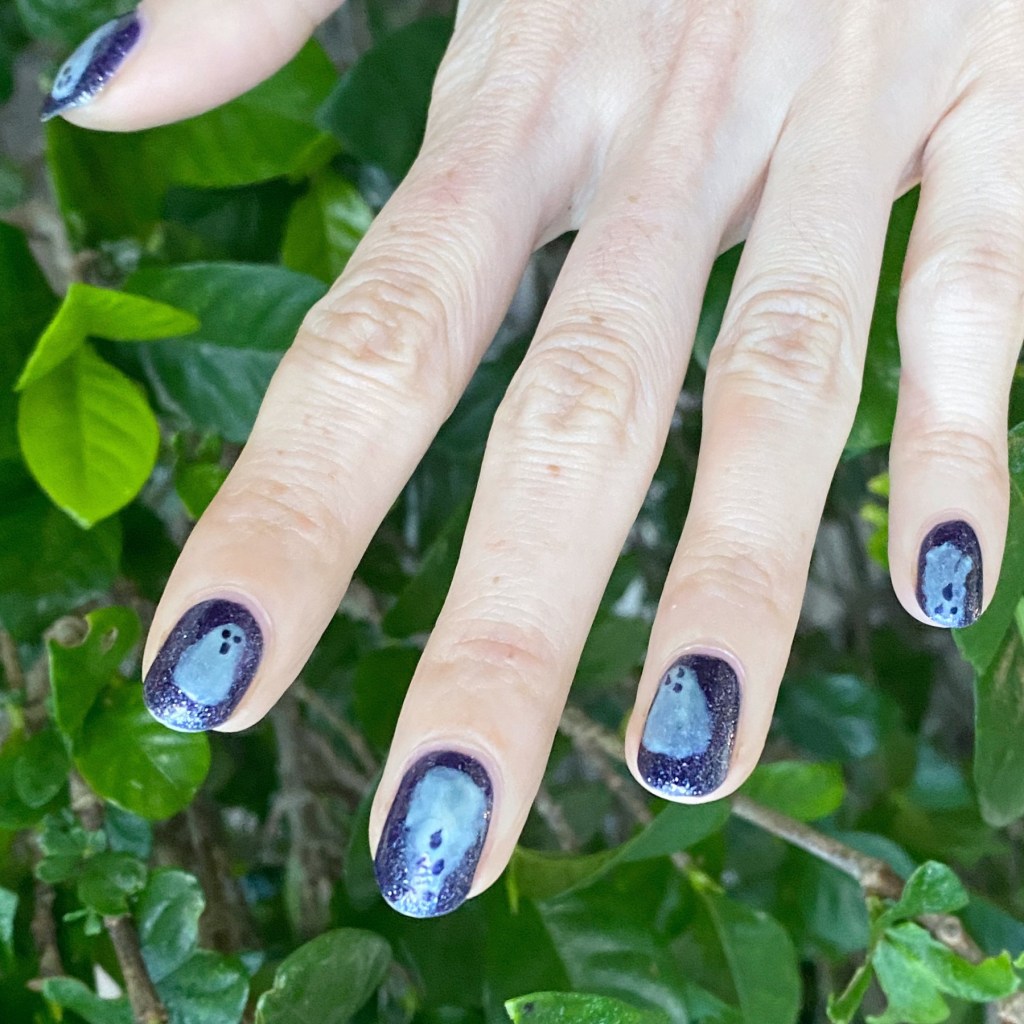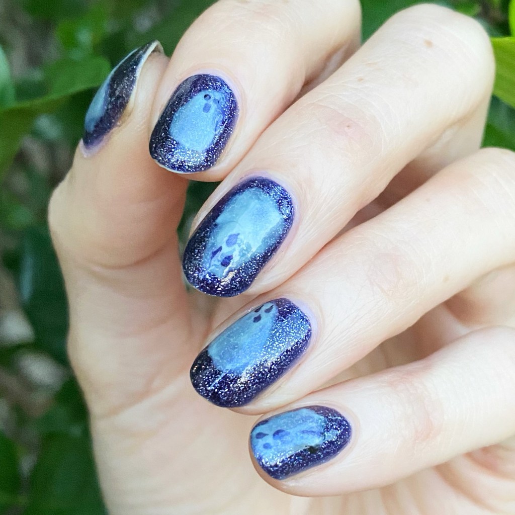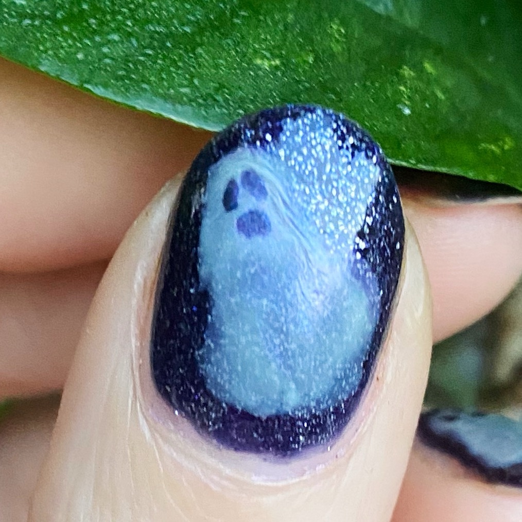 So the trick of creating these translucent ghosties is using a really, really shear white polish (or mixing a more opaque white with a clean polish to thin it out.) I Have this Essence Pastel Ombre Top Coat from years, & years ago, & while I’ve never used it for an ombre design, it works perfectly for nail art like this! I also added a bit of OPI Alter Ego for a bit of extra shimmer/glow.