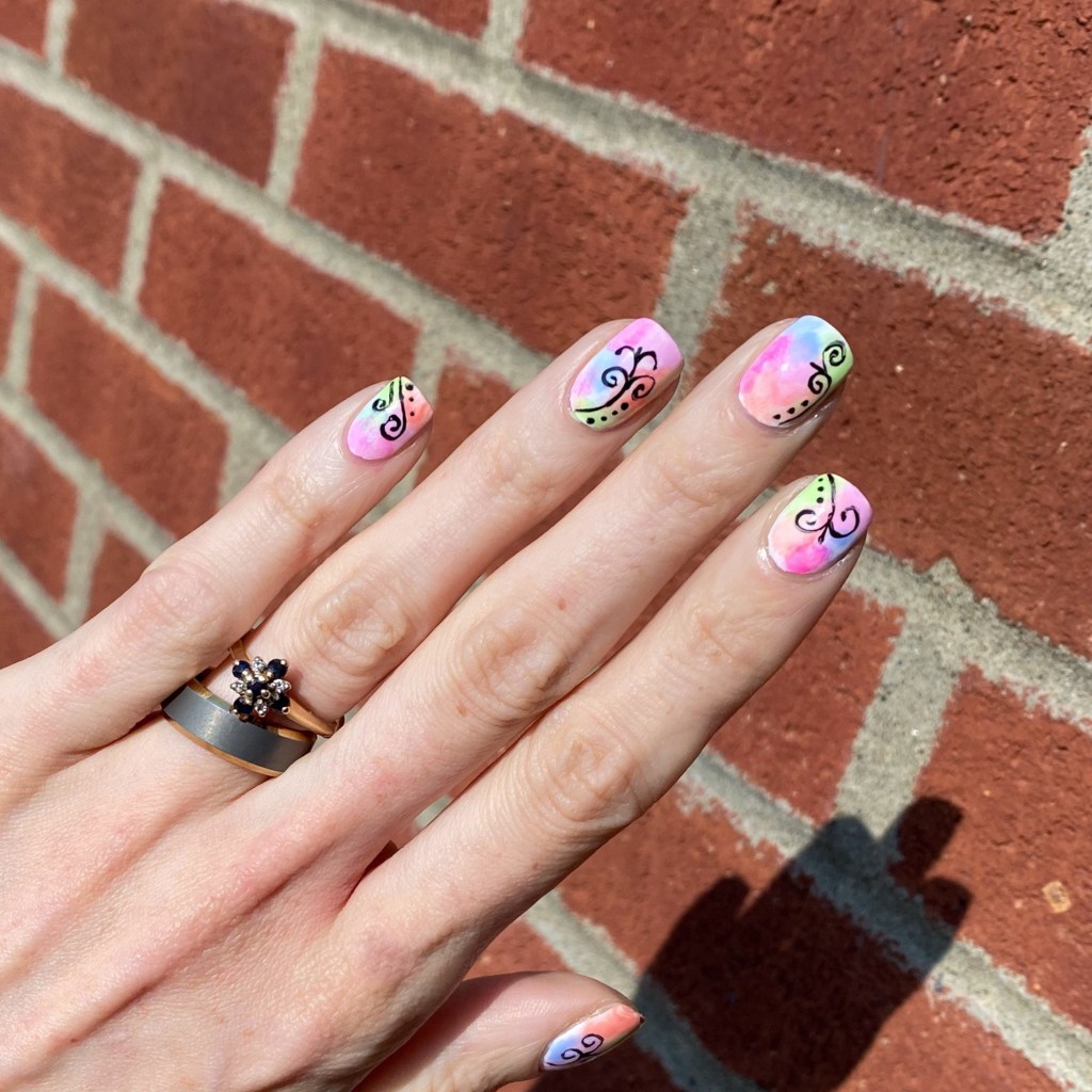 These nails were kind of an experiment because I wasn’t sure initially what I was going to create. I ended up applying drops of acrylic paint on my nails, then using the water to make it spread out a bit. My ring & pinky finger probably turned out my favourite of the 5 on this hand, but I definitely know what I’ll do next time to get the look I want.