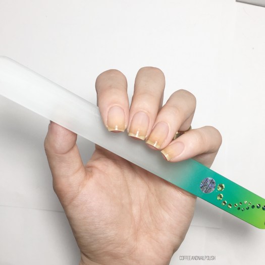 Next step, I used a good cuticle remover. Right now I’m loving Butter London Melt Away which I find is gentle but effective. I start by applying it along my cuticles, & then push back my cuticles gently using the Mont Bleu glass cuticle pusher before rinsing them off. This was my first time using a glass cuticle pusher & I was nervous because glass ( & the edges feel kind of sharp to the touch) but this pusher is surprisingly gentle. It doesn’t take much pressure at all to push back your cuticles, unlike using my previous rubber pusher. Also I was happy to see it cleaned & washed easily without being ruined by the product. Next, I always make sure to apply cuticle oil after using remover & pushing them back.
