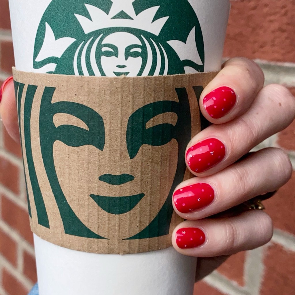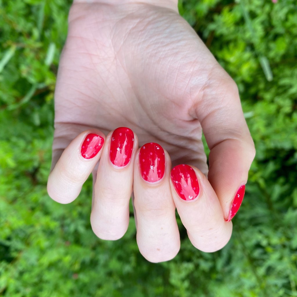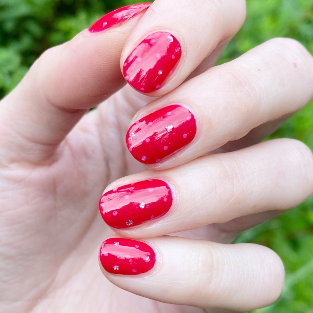 I added some pink polka dots over my base shade, with a colour sparkly ones just for fun! I think this look turned out chic & classic, but it’s also fun. From far away you get red nails, but up close you get the full fun look. & I love a nail art design like that! Polka dots were one of the first designs I ever taught myself, & they remain one of my favourites.