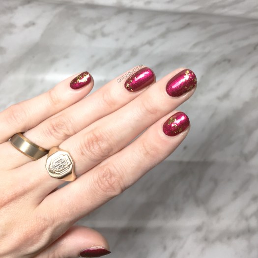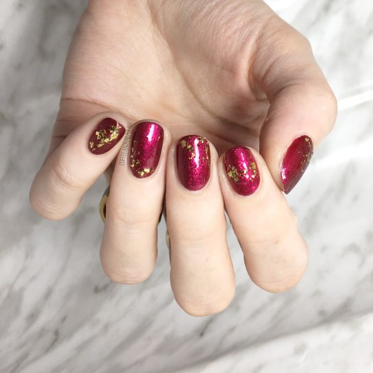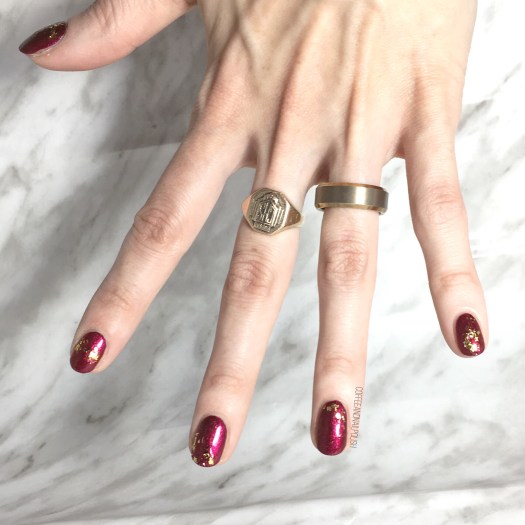 I always love a good glitter placement, & I thought these gold foil flakies from Nailstuff.ca paired so well with the red base of Morgan Taylor Don’t Toy With My Heart. It’s a little different trying to place flakies verses glitter from polish, but the end result looks just as gorgeous. I’ll definitely be trying this look with a few of the iridescent flakies I own.