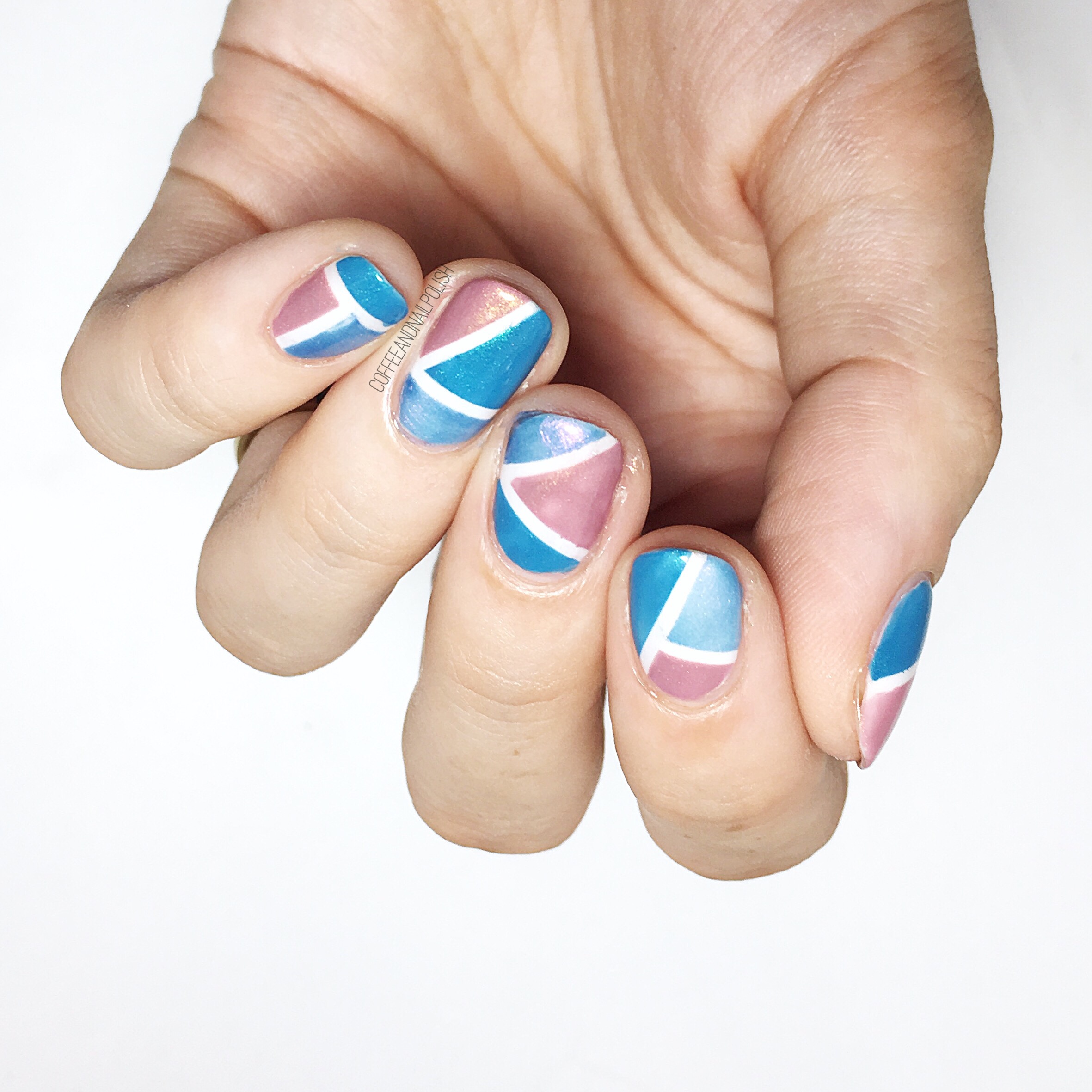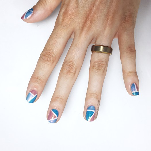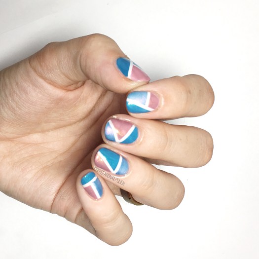 Now I couldn’t not pair all these shades together, so after failing at a gradient I decided my next best option was a colour block! & oh boy did it turn out pretty. I used Essie Sweet Soufflé for my base (because of its own underlying shimmer) & the straight vinyls from Xroma Polish & Vinyls to mark off my blocking.