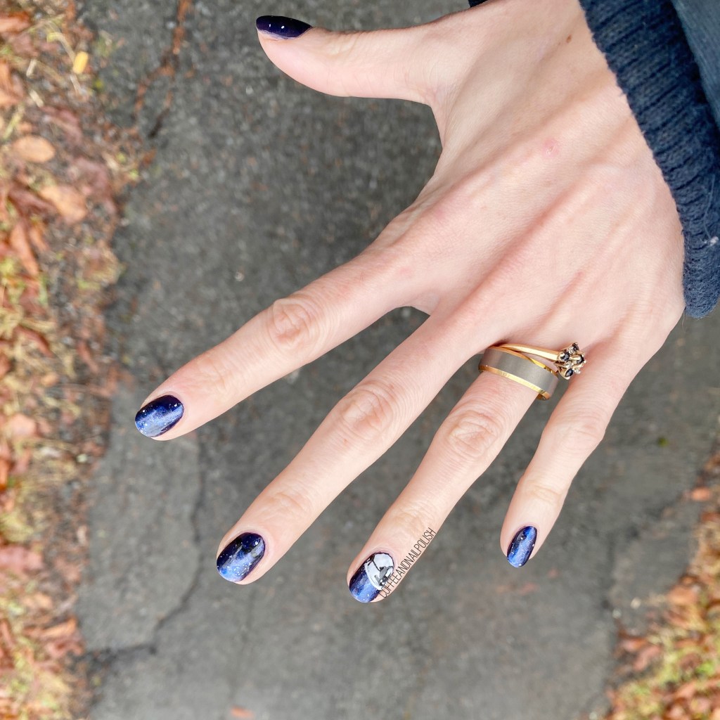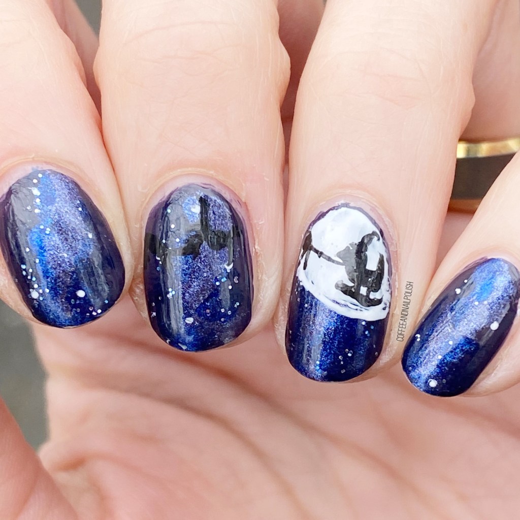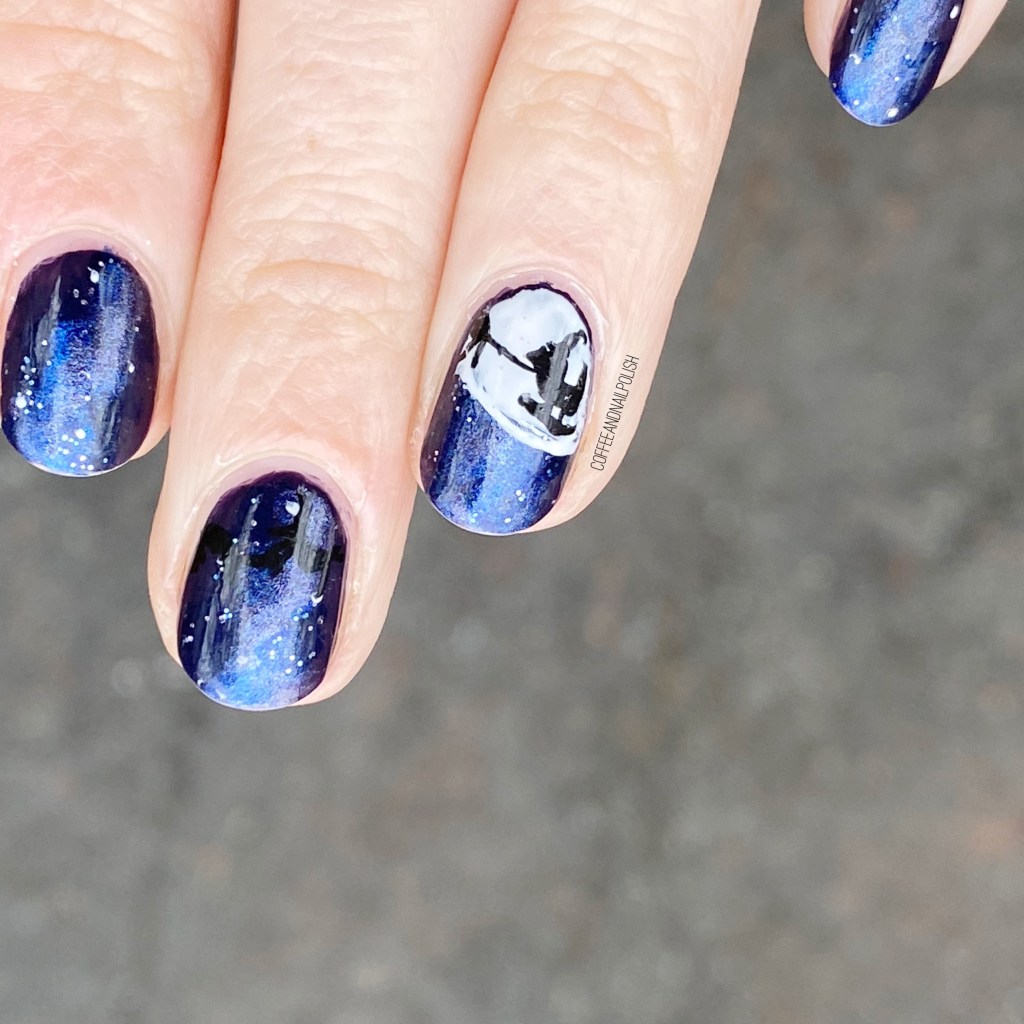 For this look, I decided that I wanted to create the silhouette of Santa’s sleigh against the moon, with a pretty night sky base. I sponged on a few beautiful blues as my base, & then painted a big moon on my nail. Once that was dry, I used my black acrylic paint to attempt to draw Santa’s sleigh with a few (barely visible) reindeer pulling it.
