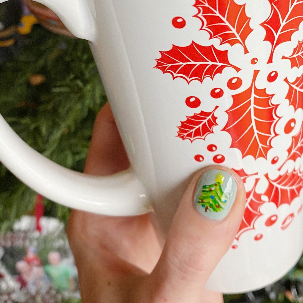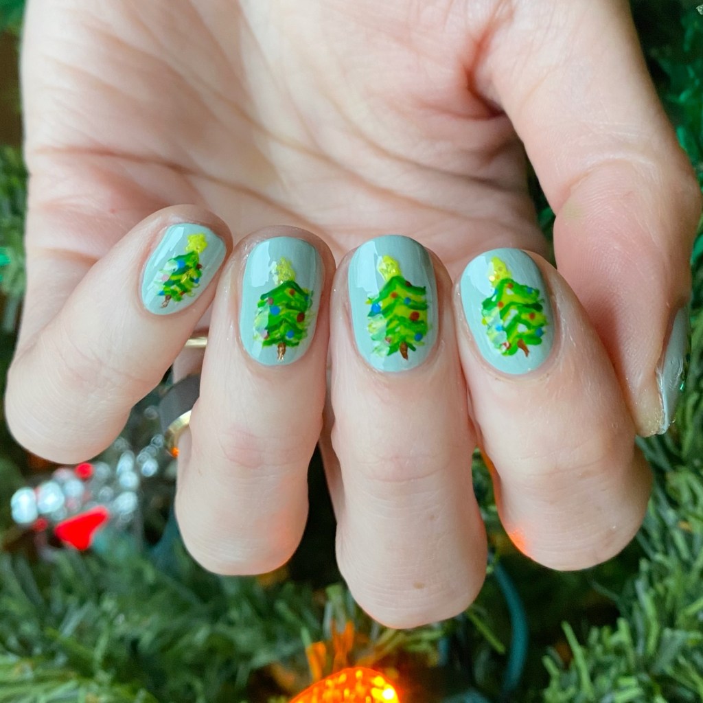 I thought this was such a fun look. It kind of reminds me of the Andy Warhol Flowers painting/print, but with Christmas ornaments instead. A little Christmas twist & different from the Christmas tree looks I usually go for. Plus the green glittery polish is so beautiful! I didn’t realize how much glitter coverage it actually had. So pretty!