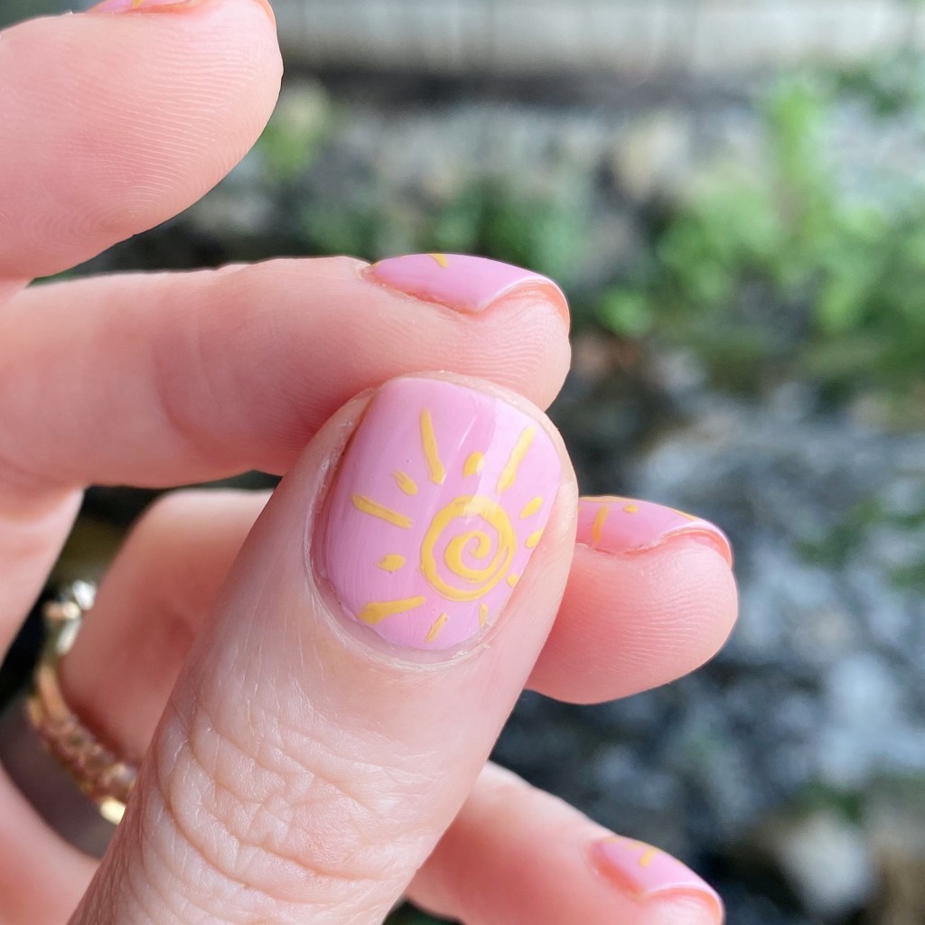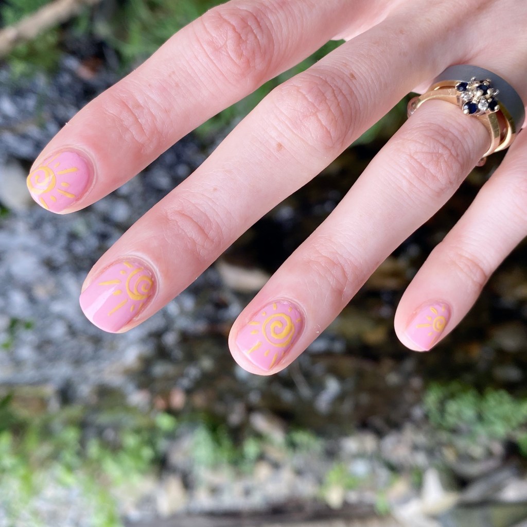 This was not actually the original design I did — that one I smeared with top coat. But I do like this one better. I love the pop of yellow over the pink base, & I think my swirly suns turned out perfect.