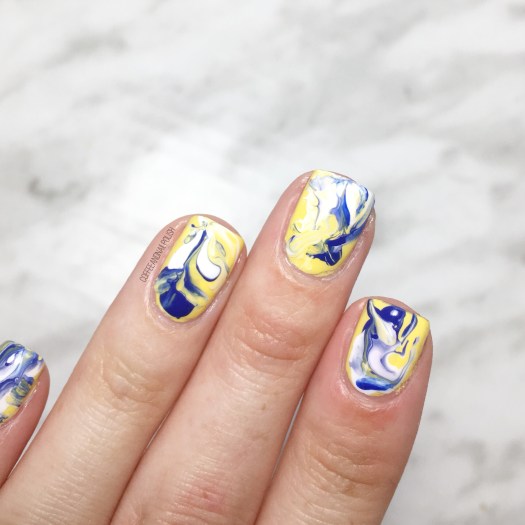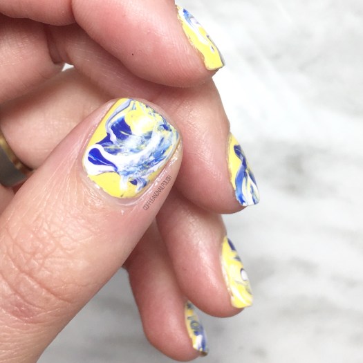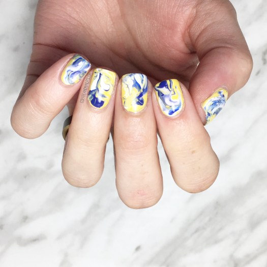 This was actually a surprisingly easy & not messy way to create marble–all I did was apply blob of polish directly to my base colour (yellow) then brushed around on the nail using my fan brush to create the marble effect. If a nail wasn’t quite turning out how I wanted, I’d add a bit more polish of choice to give it the look I was going for.