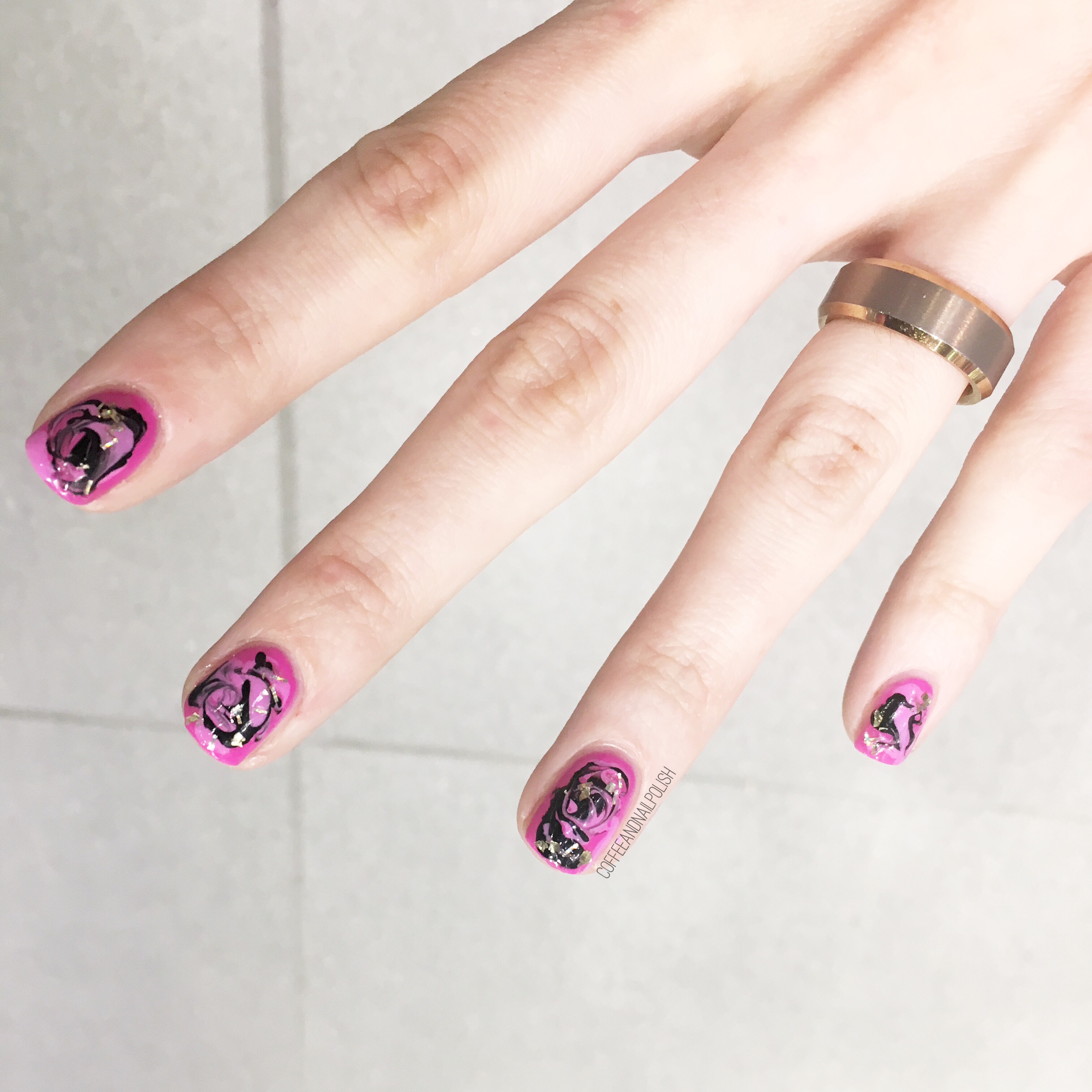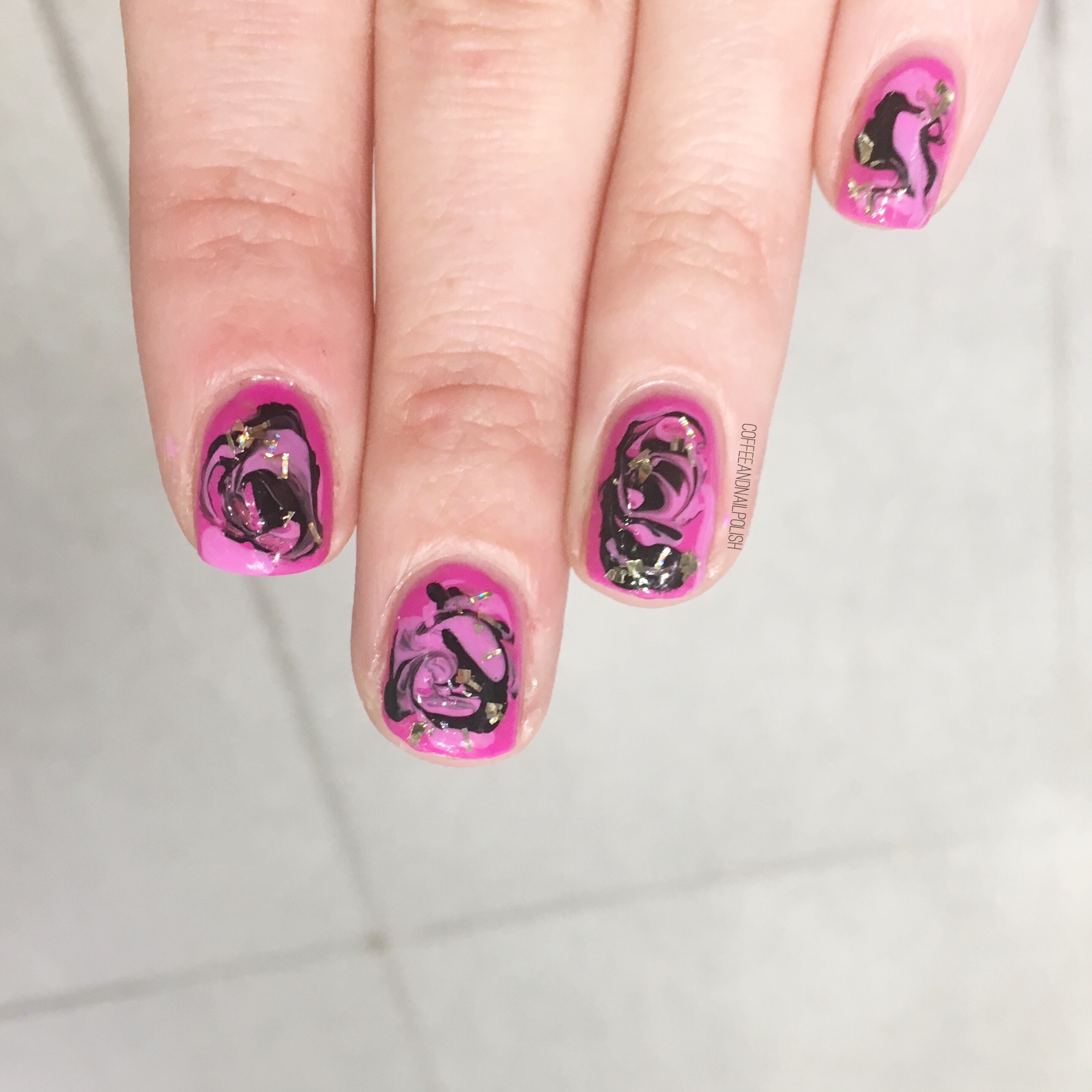 It’s been forever since I attempted any kind of drag marble design & my base shade (Ardene Dashing) was a little too quick drying which added some difficulty to my look. But the more I look at this design, the more it’s grown on me. I added a bit of gold glitter flakes which I’m not sure if it added to the design, but I was a little haphazard with my placement.