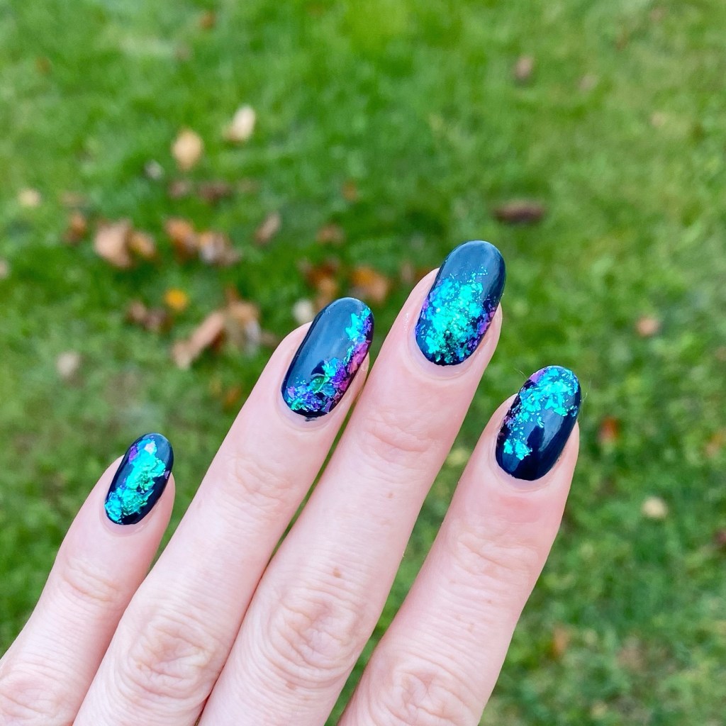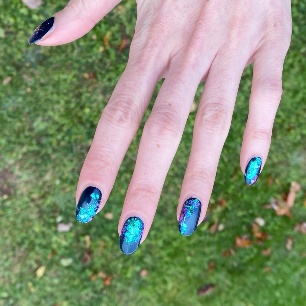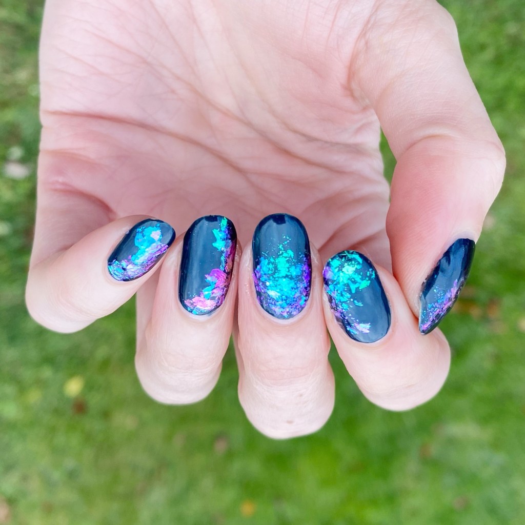 I realized the other day I hadn’t played with any of my flakies or Chrome powders in my collection, & got this idea to do a look using them in a similar look to my favourite stained glass technique. & I think they turned out so pretty!