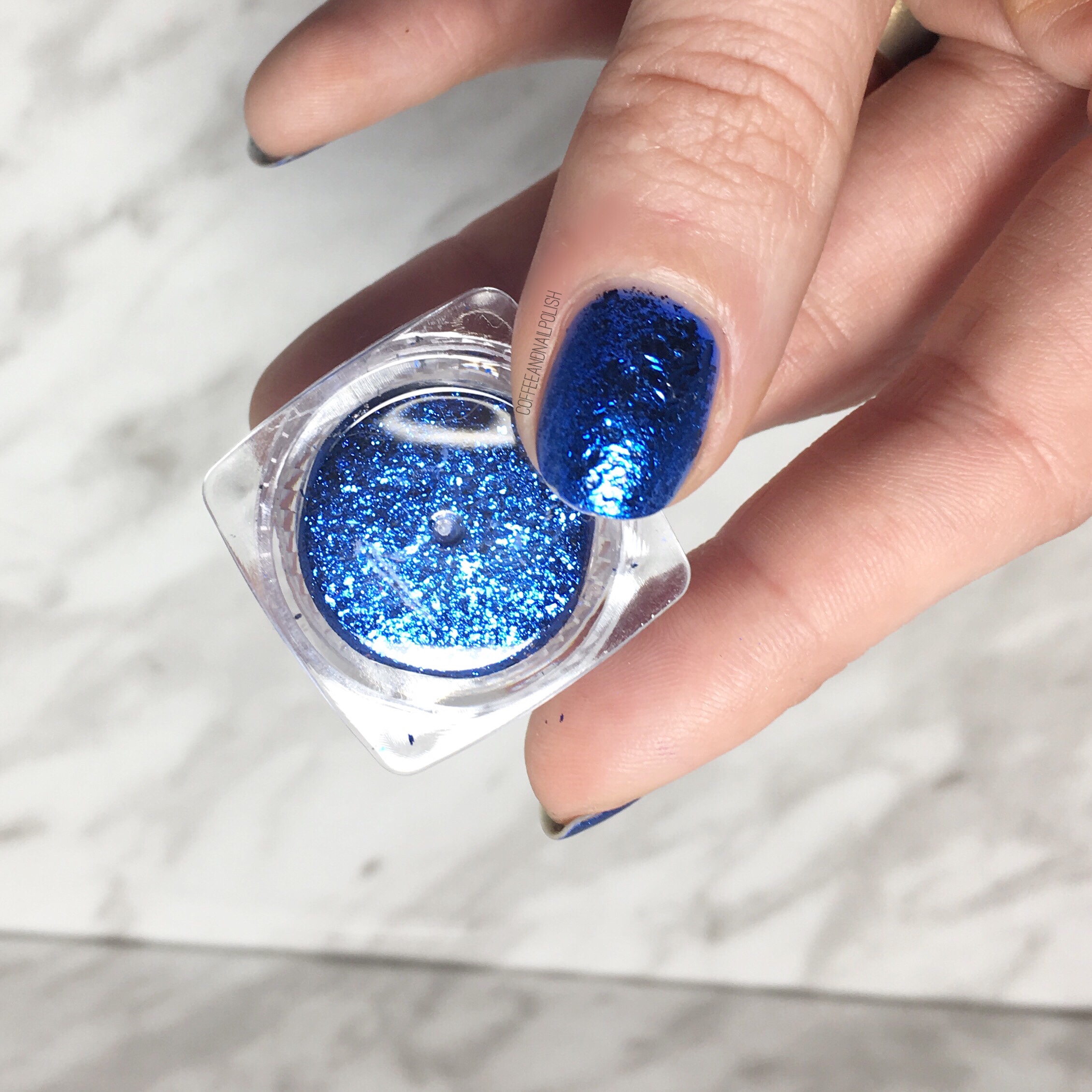 For this look, I started off by painting my nails in a complimentary shade (Sally Hansen original Pacific Blue). After a few moments applied a coat of Finger Paints Peel Off Base Coat over my blue, which is my preferred method of flakie application. Once my nails had dried somewhat, I dipped the applicator into the pot of flakies, pulled a small amount out, & brushed them down over the nail. After each nail was covered I sealed the look in with top coat.
