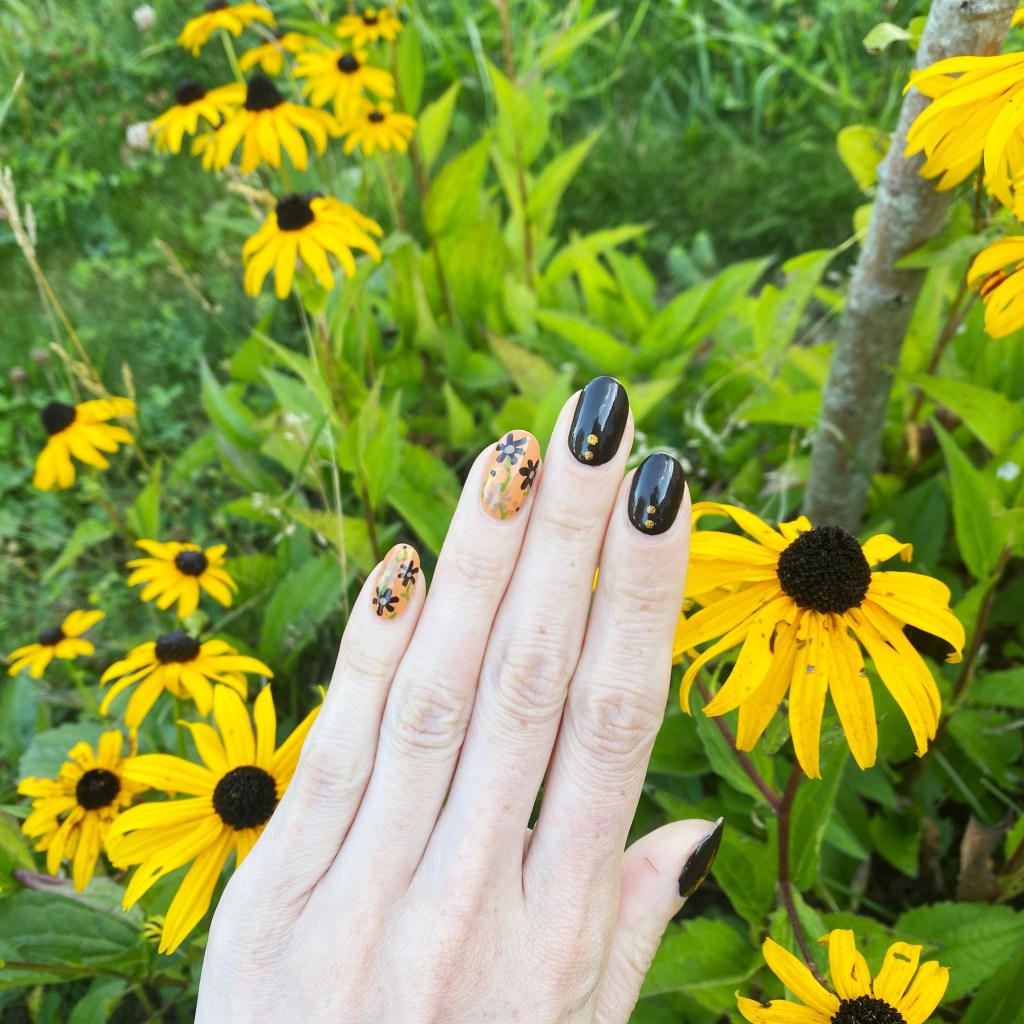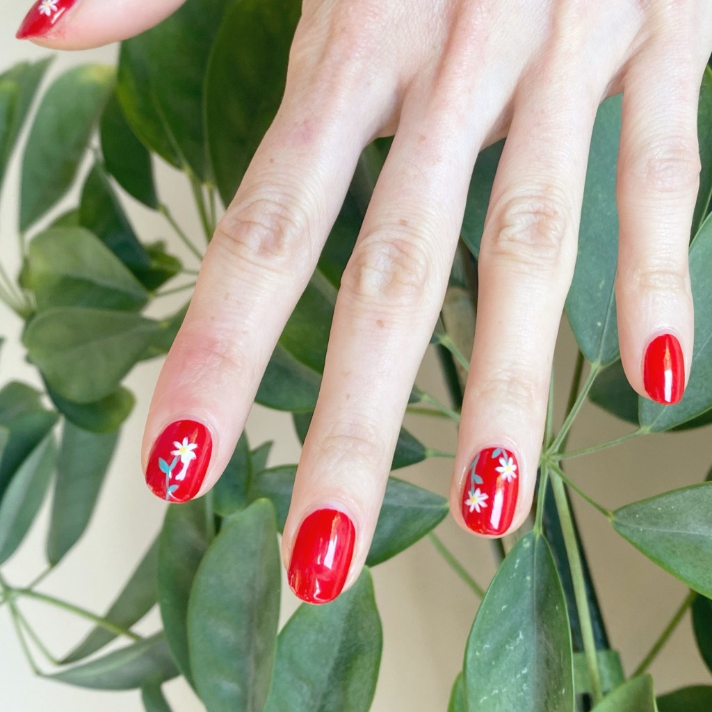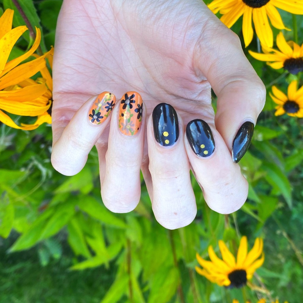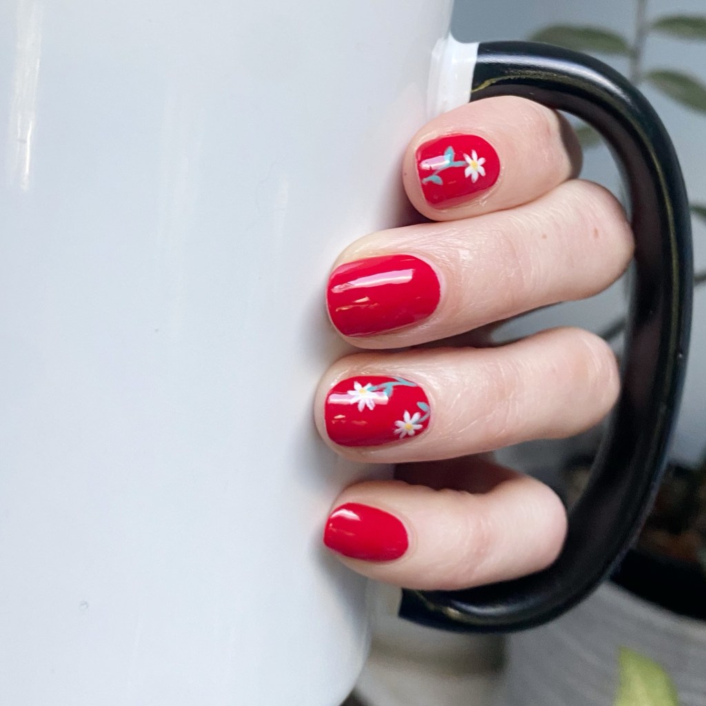Okay first off — I decided to paint these at 9:30pm in very minimal light, so I’m shocked they turned out as good as they did! Because trying to see those roses on this dark base colour was a challenge, I won’t lie.