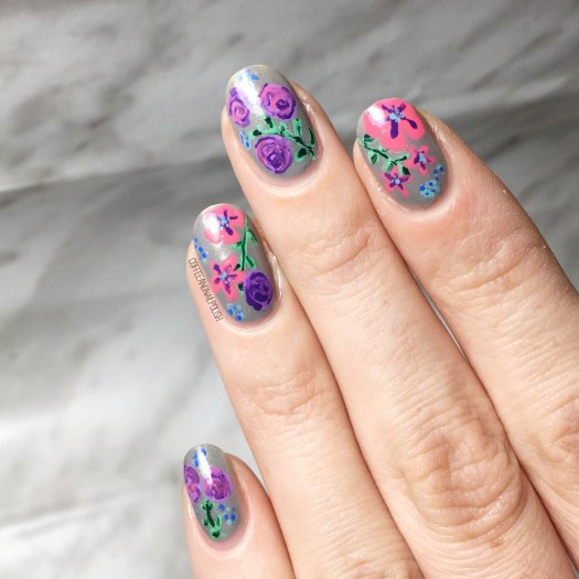 Today’s design is another floral featuring pink & purple. This design also turned out a little tropical to me which I’m really loving. I’m still trying to practice creating other flowers than roses–I’ve been doing roses so long they’re kind of easy for me, but other flowers aren’t as easy. Hopefully with practice, it’ll be just as simple. I dream of creating florals as beautiful as my floral idols @just1nail & @polishpeach. They just make it look so easy.