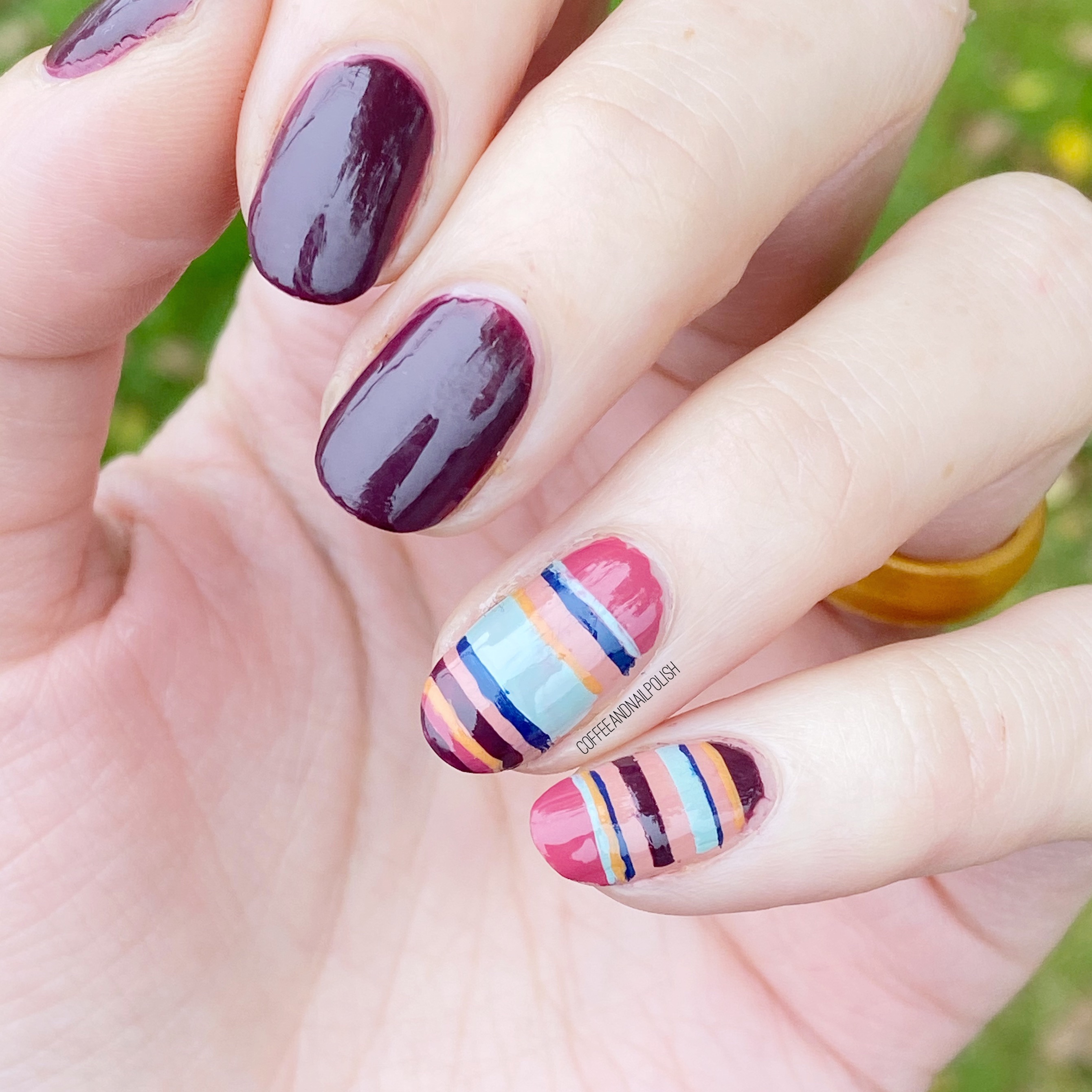 For this look, I used some straight nail vinyls to create my initial blocks of colour. Then I went in with my NailStuff striper brush to create more lines, kind of overlapping each other which gives the lines of a bit of a fuller look (& it’s way easier to create straight lines when you’re following already straight lines!).