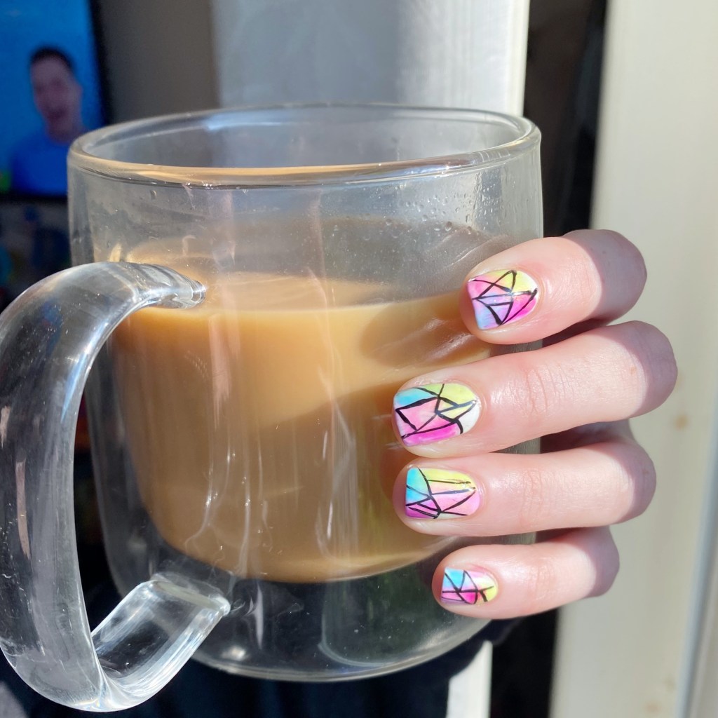 I’m not going to lie, I’m absolutely obsessed with this nail art look. I wore it from Tuesday to Thursday, & was actually sad to take it off! This is not my first version of this design, but it might be my most favourite I’ve done.. at least in a while! The colours blended so beautifully together, & I think my lines turned out really good. Anytime I freehand a clean line manicure, I always feel some crazy pride!
