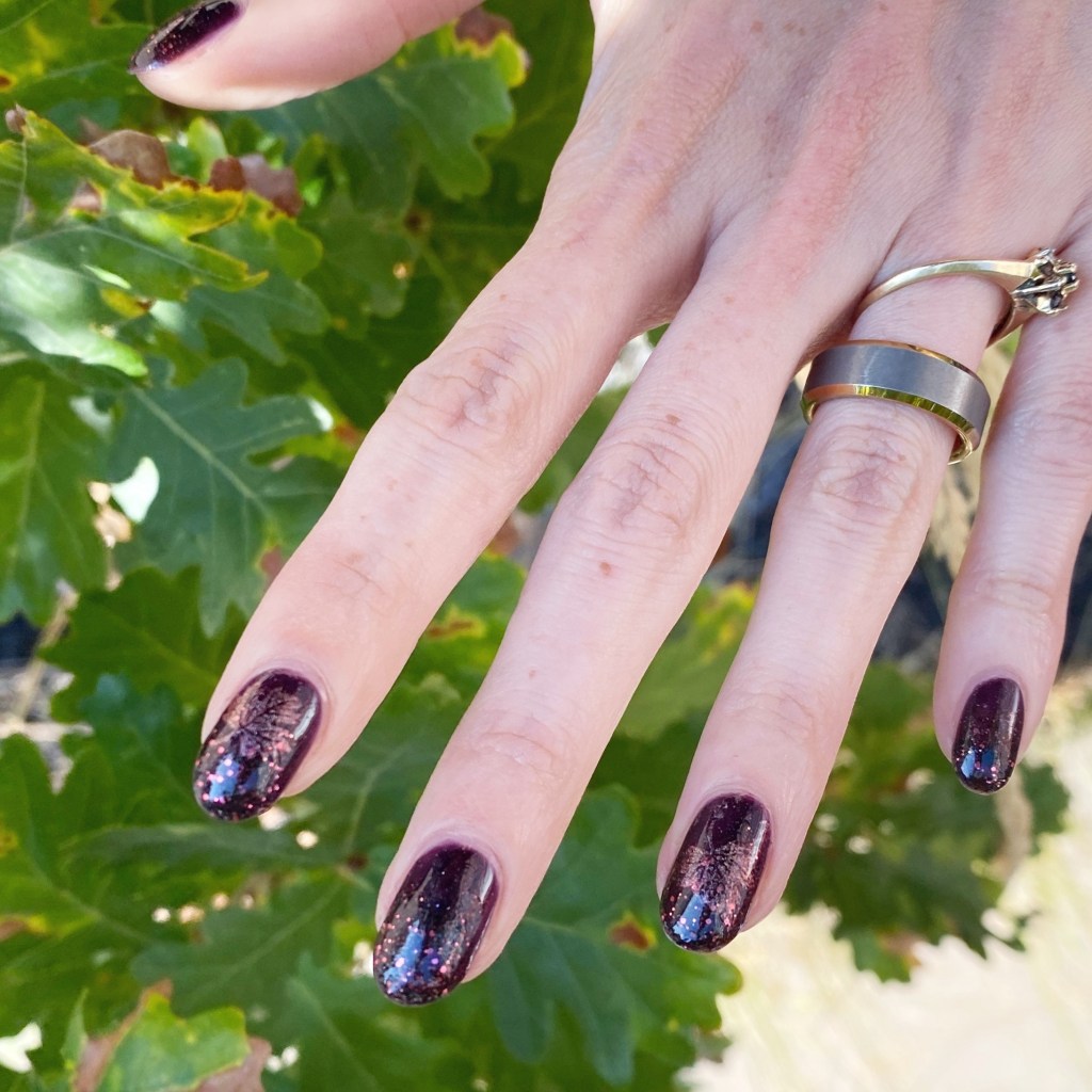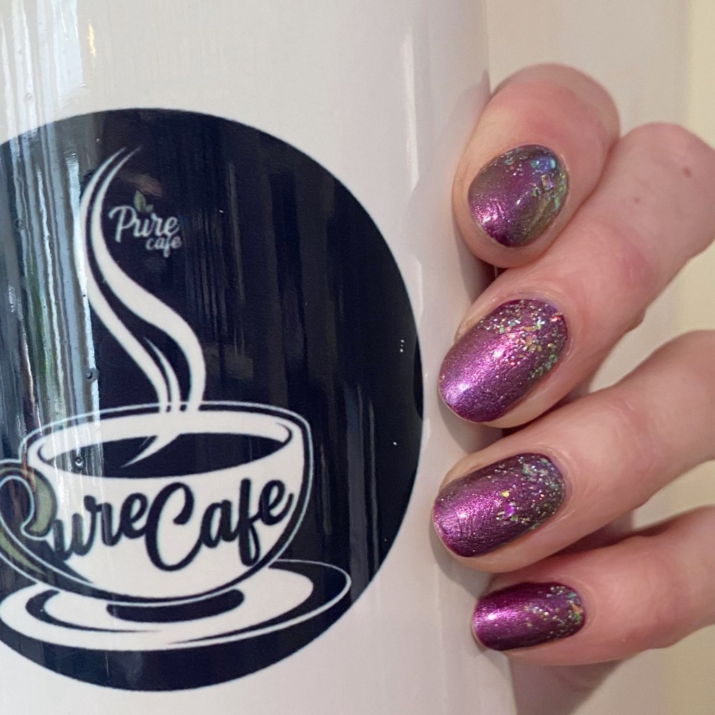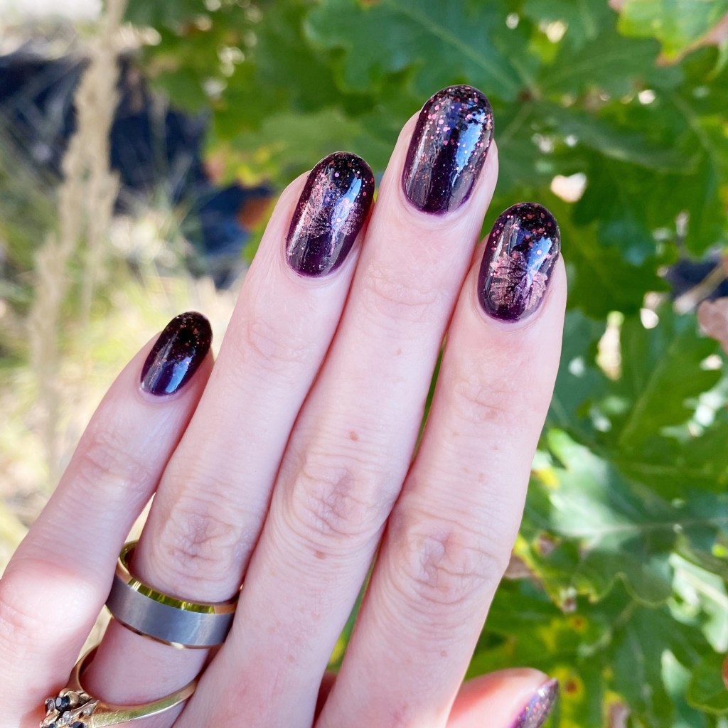 I’m obsessed with this combination. First off, Nova is a gorgeous topper which transforms a cream polish. The glitter then gives it an extra pow! & sparkle. It creates a beautiful purple-y colour. Very Autumn-y.