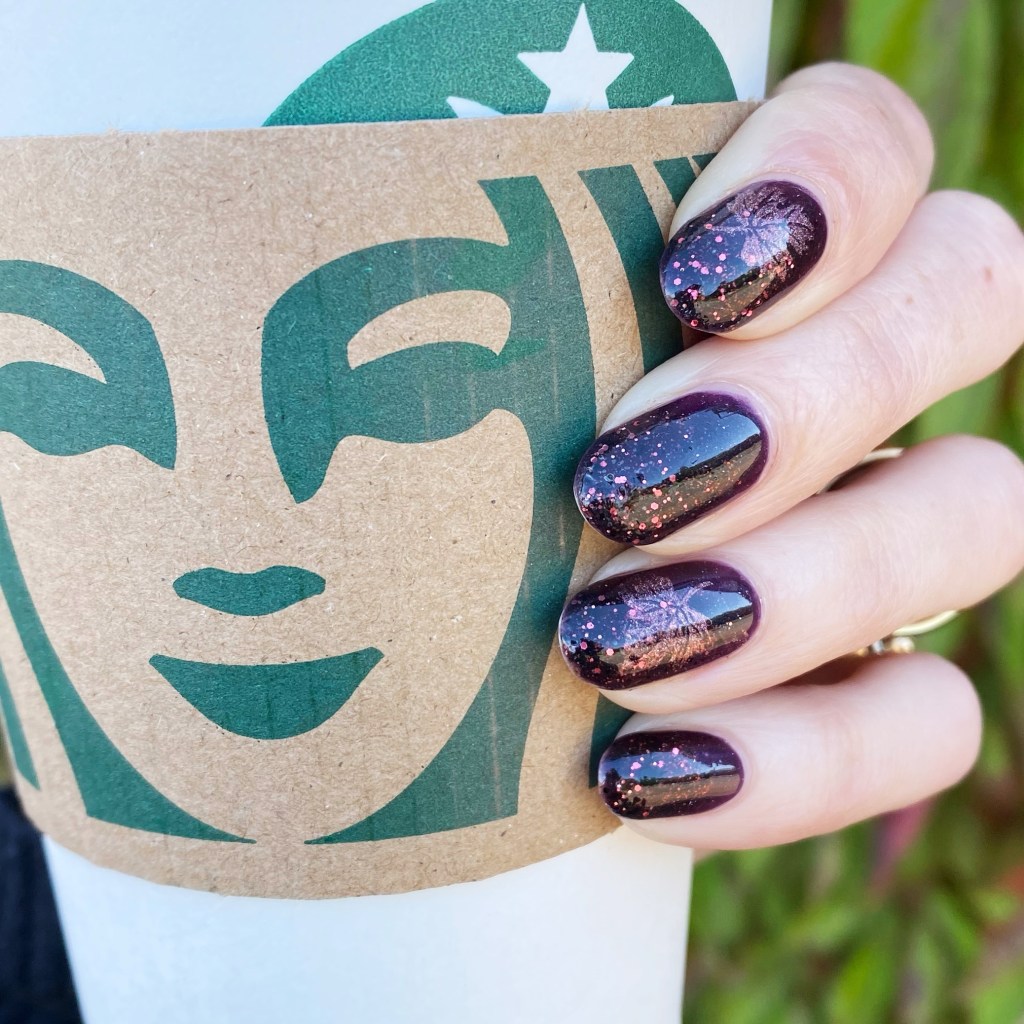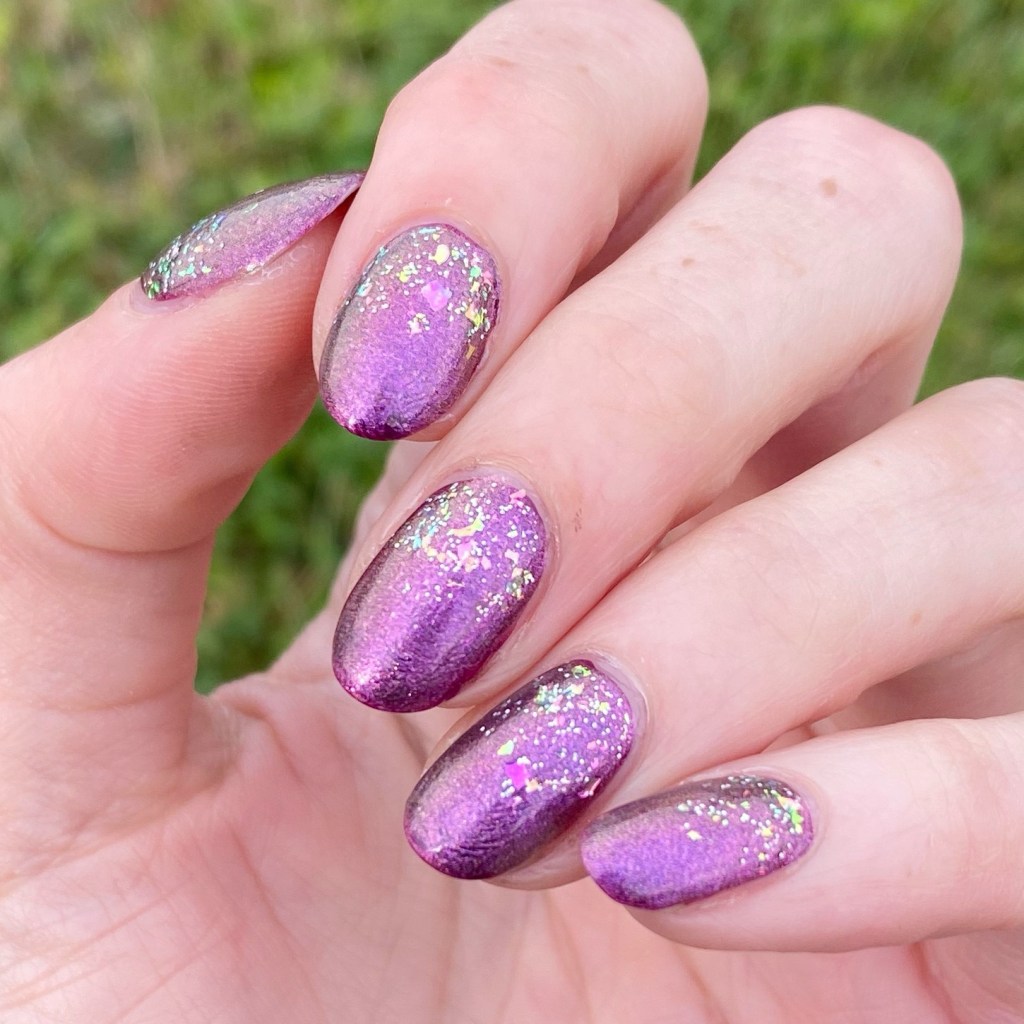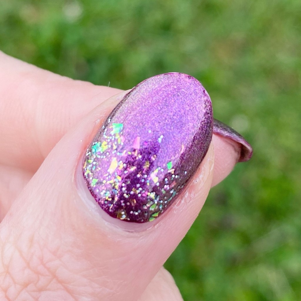 I’m obsessed with this combination. First off, Nova is a gorgeous topper which transforms a cream polish. The glitter then gives it an extra pow! & sparkle. It creates a beautiful purple-y colour. Very Autumn-y.
