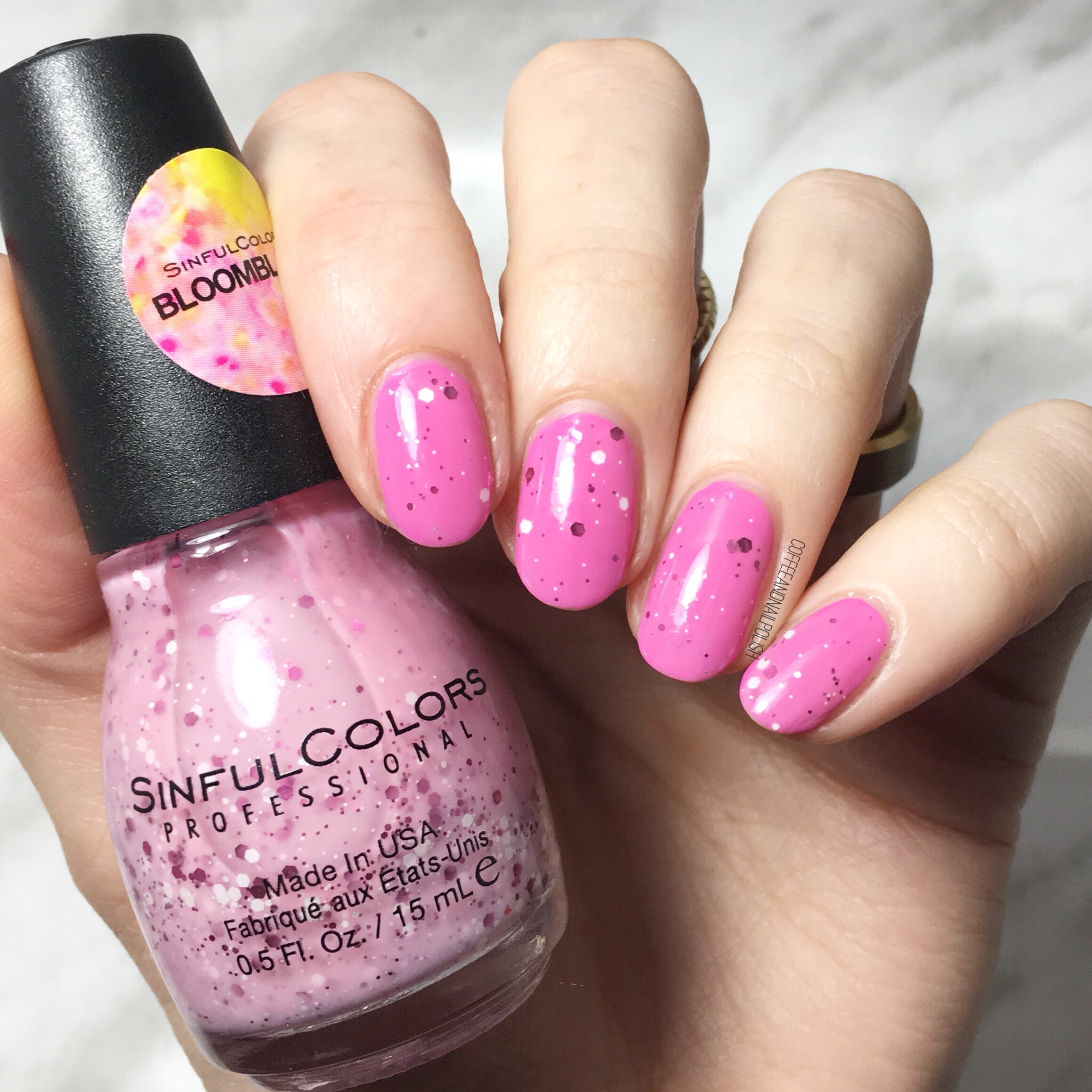 Last, but definitely not least, is Sinful Colors Bloom Blast in Flower Power. This milky pink shade is stuffed full of large & tiny matte pink metallic & white glitters. I belive it’s supposed to be worn on it’s own but I think it looks best over top other pink polishes. This is one coat over OPI Two Timing the Zones. How cute does this look? I know not everyone is a nail art person, so a topper like this is a great way of zazzing up your nails without having to worry about freehanding anything! It’s almost a dotticure without any of the work!