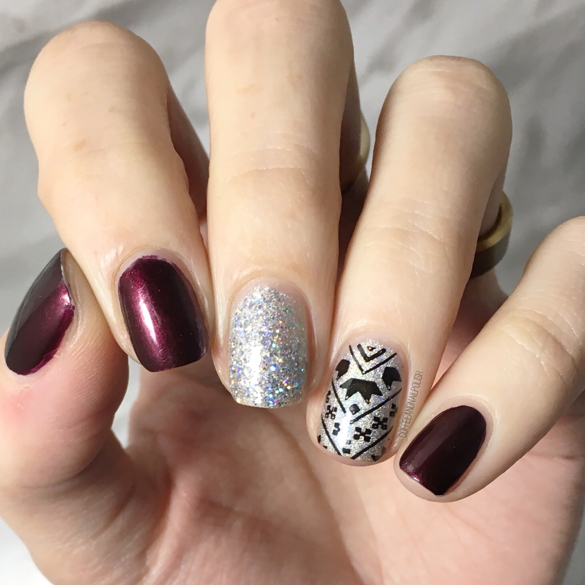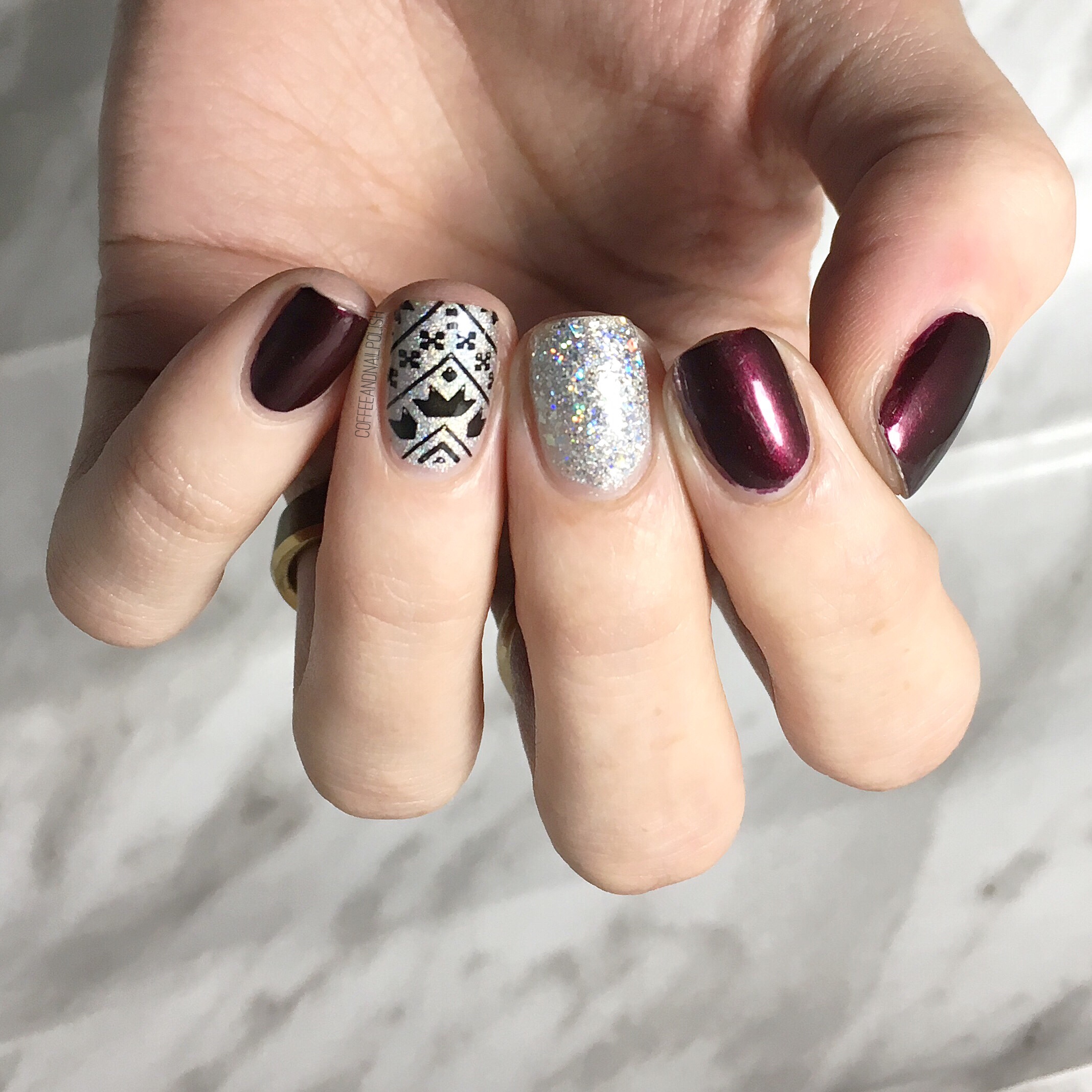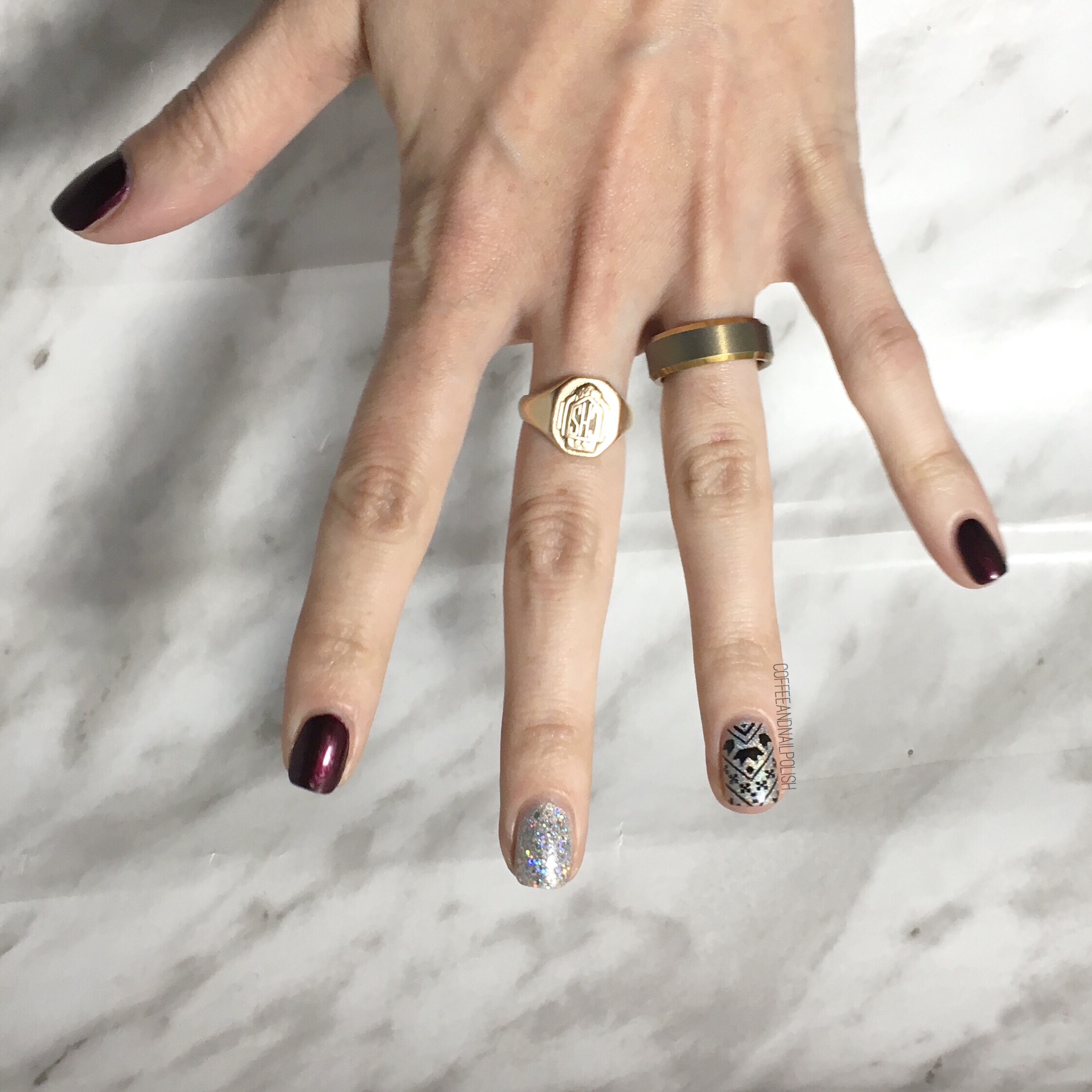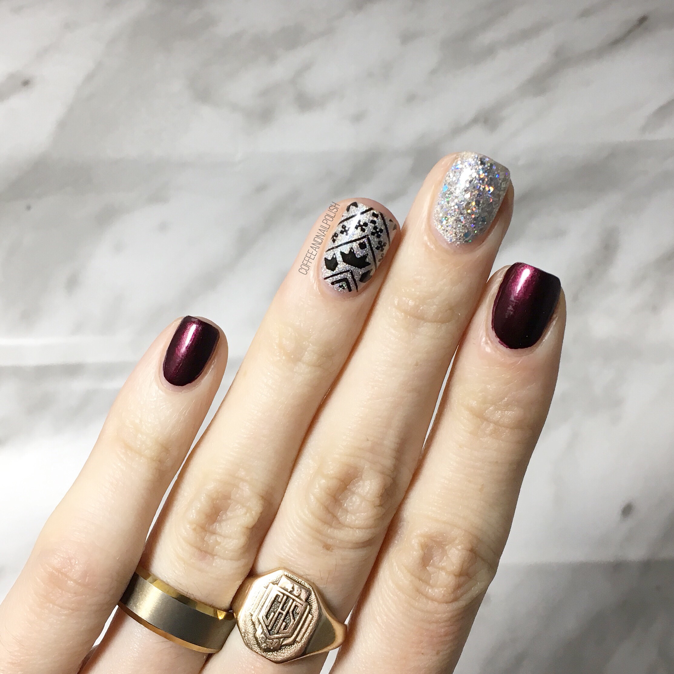 I wore this nail art design the other night when I was invited to a Mark’s Well Worn Media Event–the first blogger event I’ve ever been invited to! It was pretty exciting & obviously I needed to wear something fancy on my nails for the occasion. & what is more fancy than some holo glitter & a little stamping accent nail. ✨