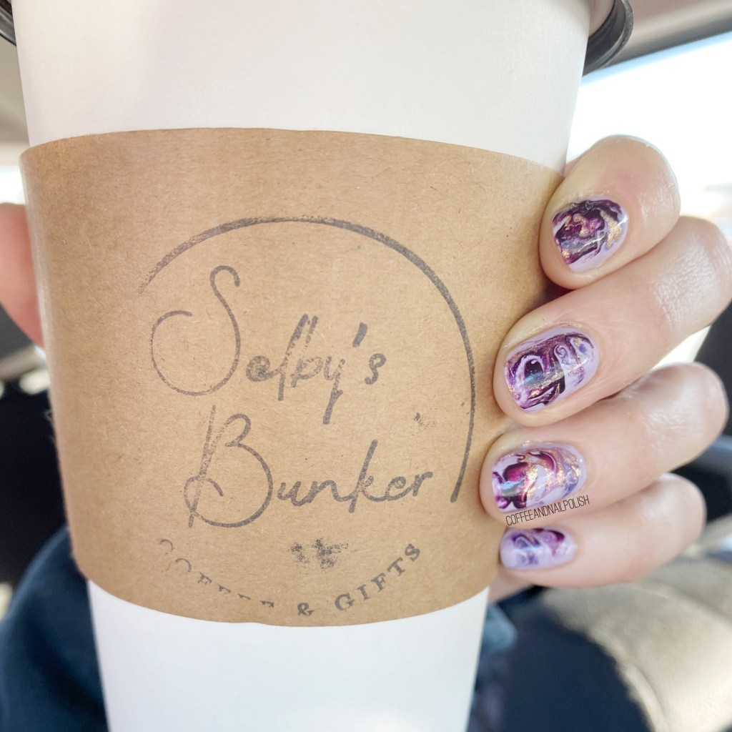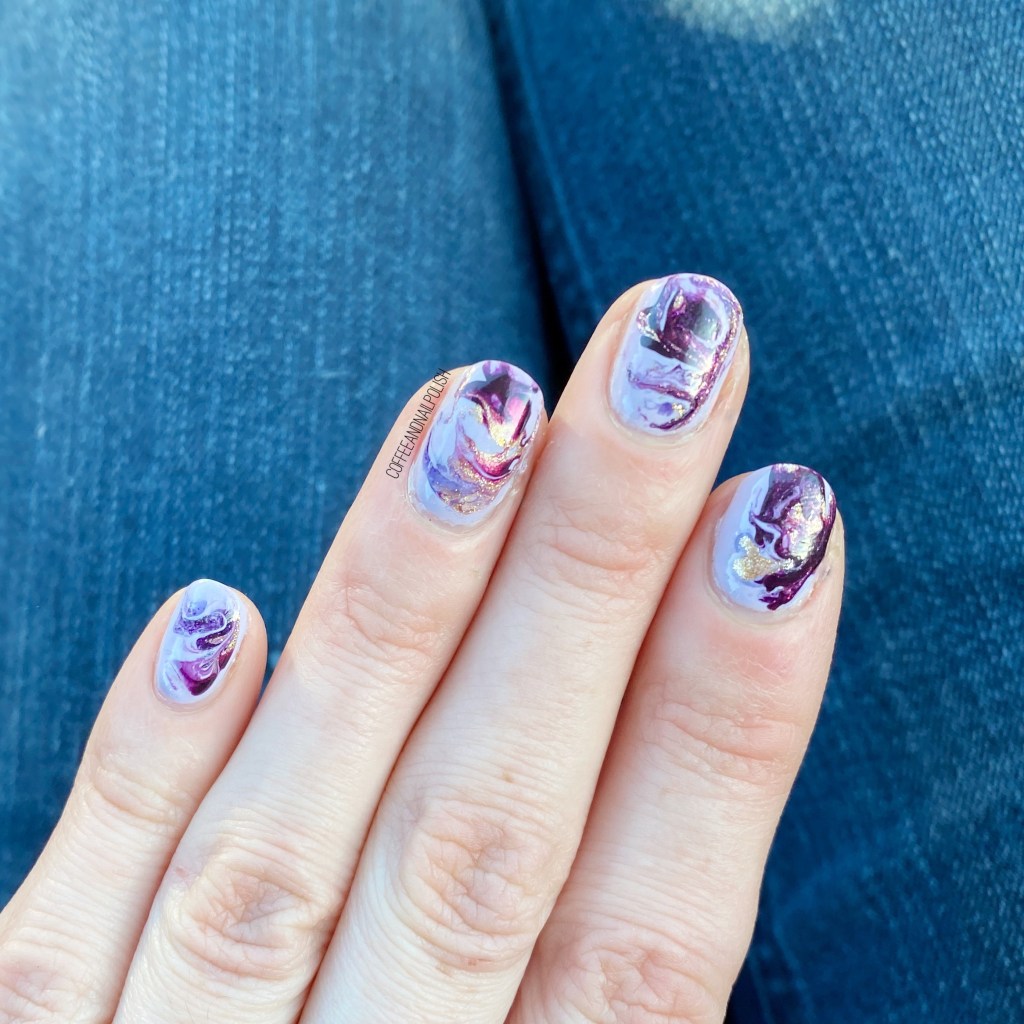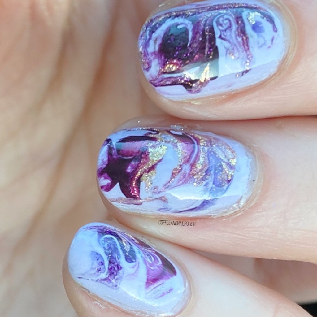 Really loving the end result of this marbling. I always have a bit of trouble with the first few nails, but we always get it figured it. Also I love the purple & gold colour combination forever. I don’t think I could ever get tired of purple nail polish! Plus I don’t think I’ve ever worn this pretty purple I won from Beyond the Nail a few years ago (via Instagram). They actually moved bases to my city, so I’m excited to start purchasing more shades from them in the future because they make gorgeous polishes!