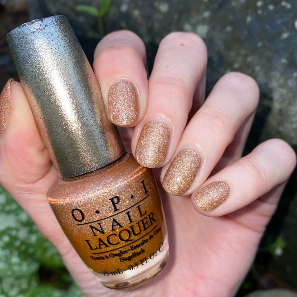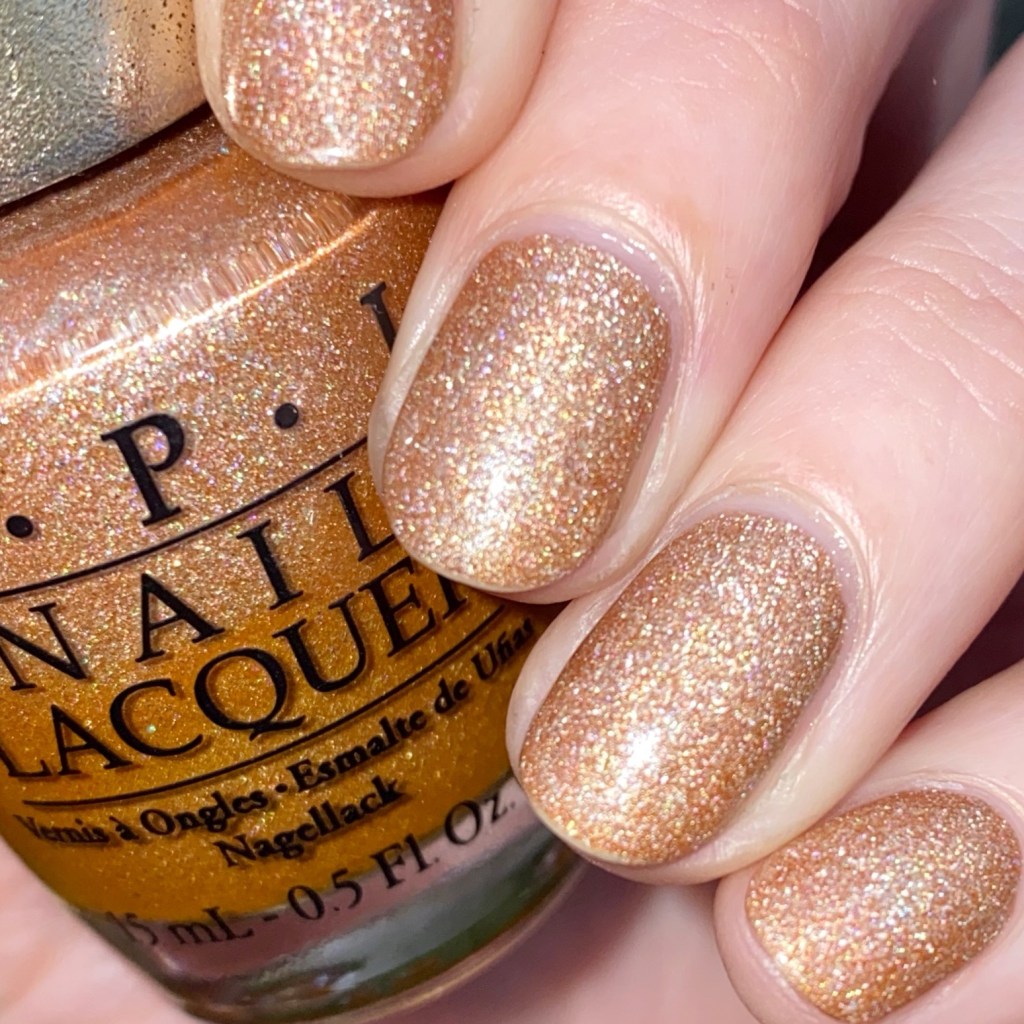 This gorgeous gold holographic polish was released as part of OPI’s now discontinued Designer Series collection of nail polishes which were more extravagant than their core line — think lots of glitter, especially holographic! The polishes looked like jewels on your nails, which I’m guessing was the idea. I have a few of their shades from this collection — including DS Extravagance which I was gifted for my birthday in the beginning of my nail polish journey.